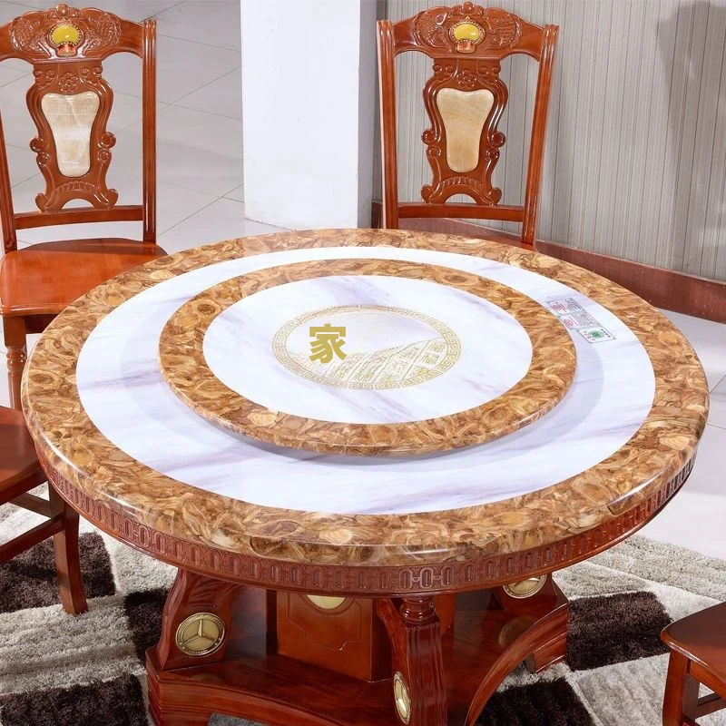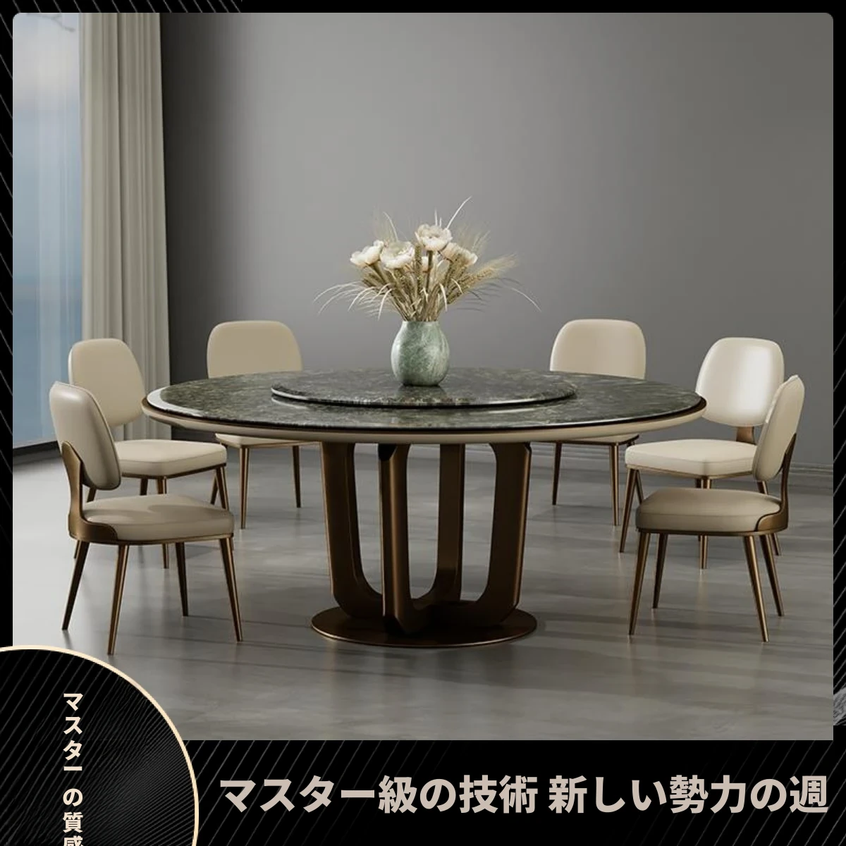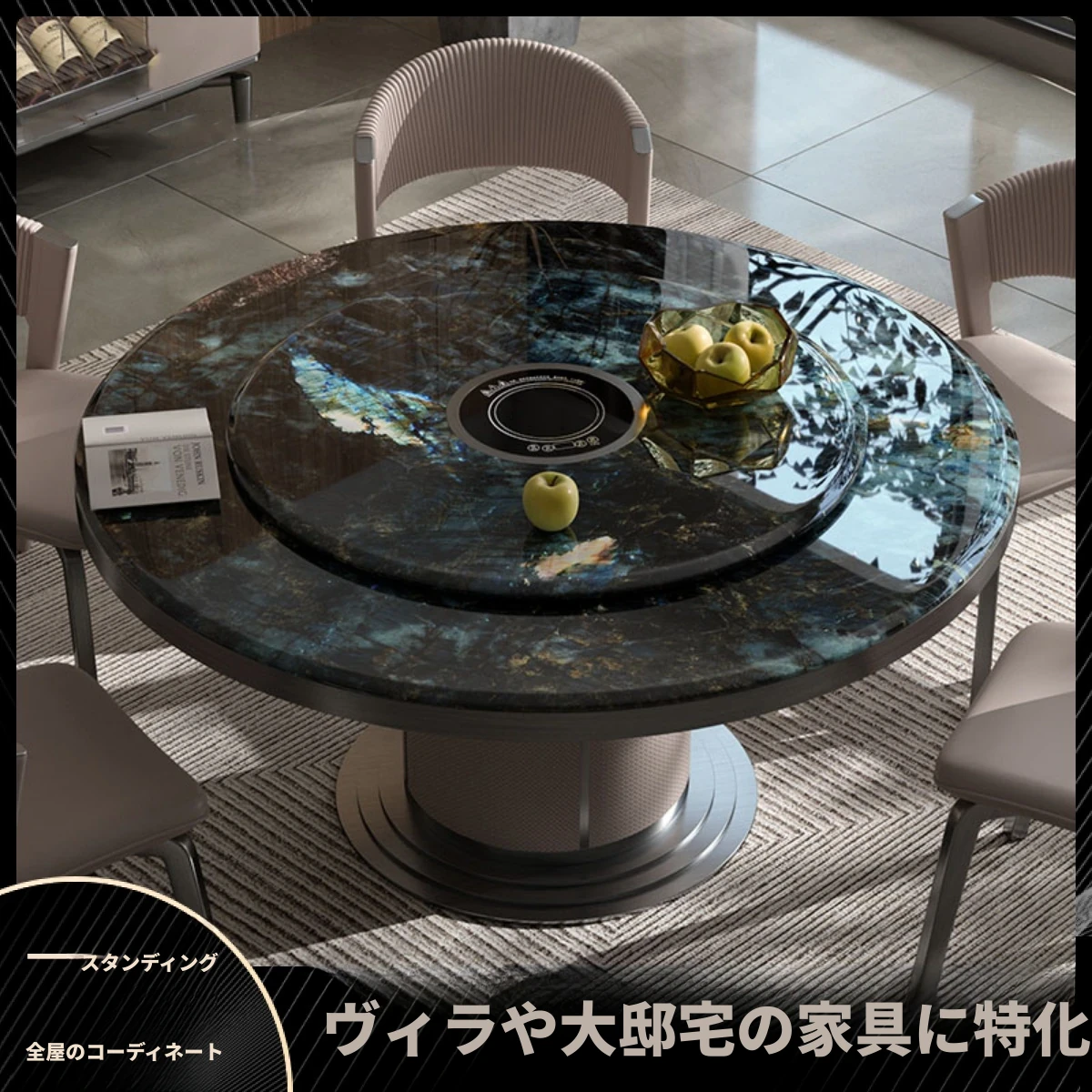 高級天然大理石使用のラグジュアリーな回転式ダイニングテーブル&チェアセット!電磁調理器付きの電動円形テーブルで、スタイリッシュな食事体験を実現。おしゃれなインテリアにもぴったり!
