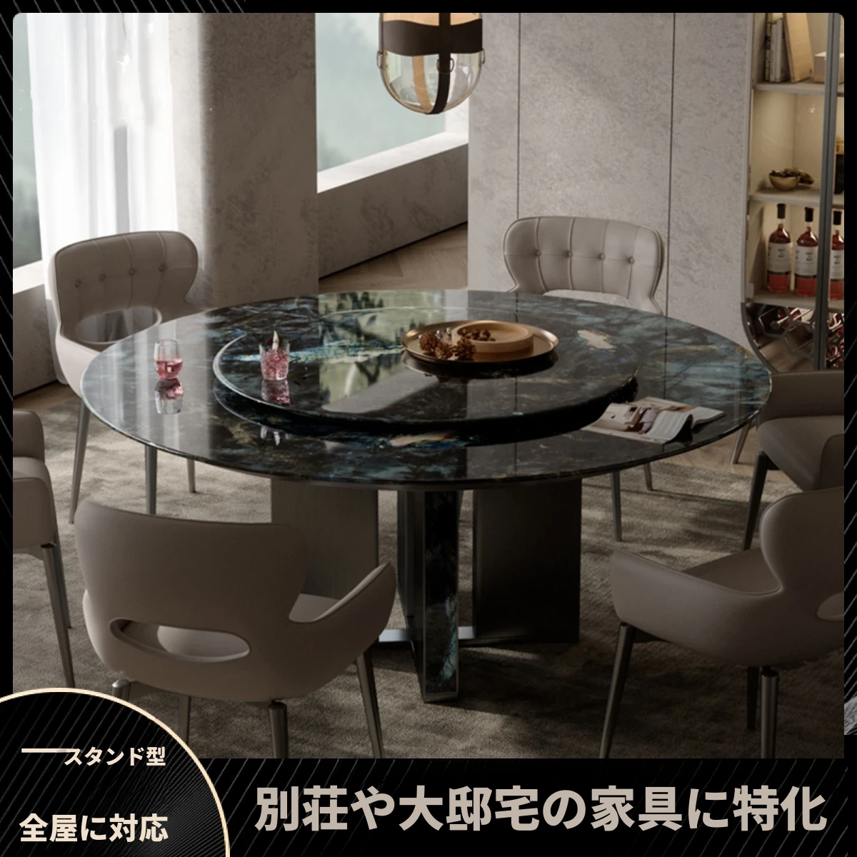高級感溢れるラグジュアリーな青いサファイアデザインの円形ダイニングテーブル - 天然大理石使用、モダンでシンプルな別荘向けレストラン家具。おしゃれな空間を演出します!