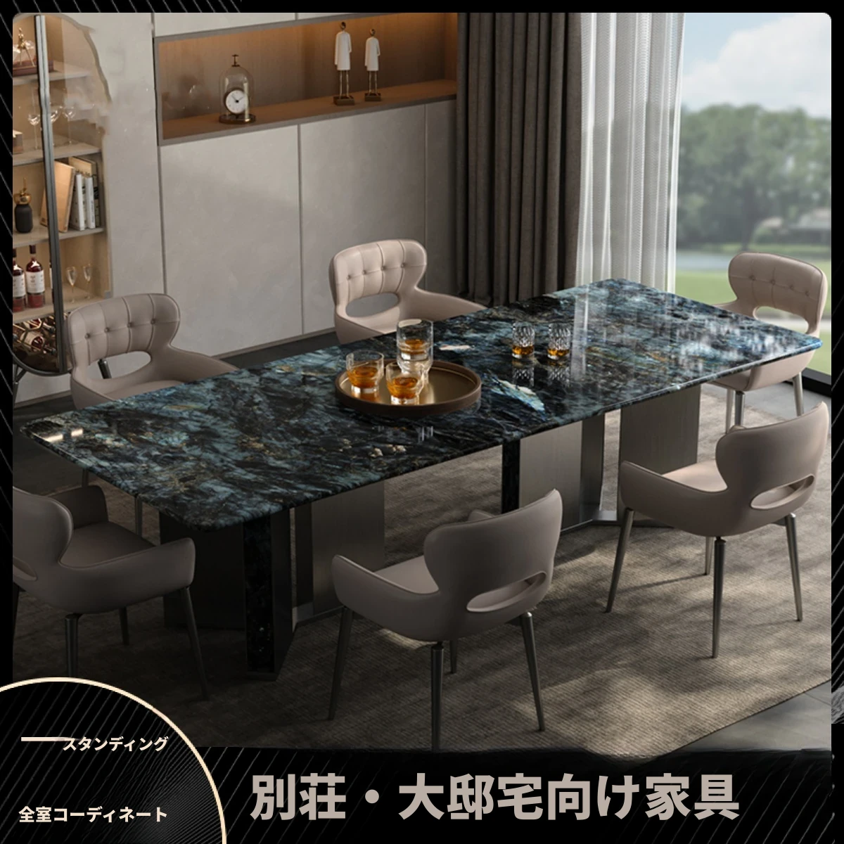 高級天然大理石使用のラグジュアリーなブルージェイドダイニングテーブルセット 202モデル 別荘向け 長方形デザインで、優雅な食卓を演出!