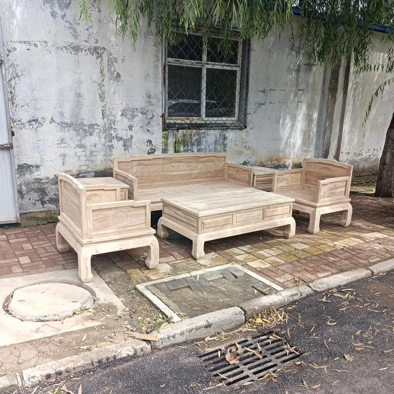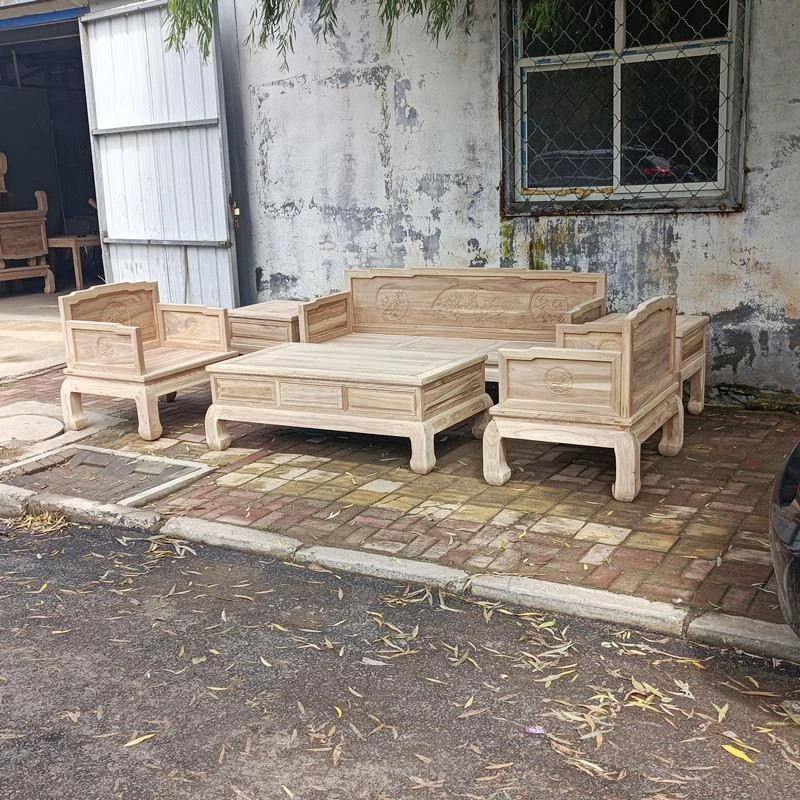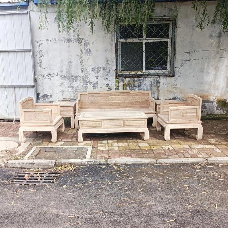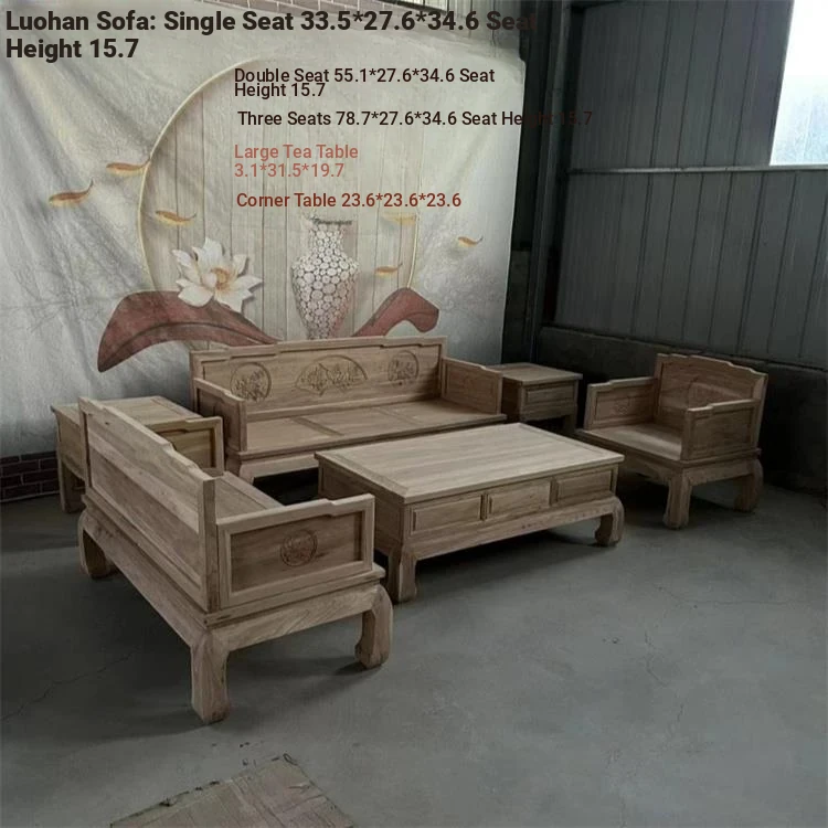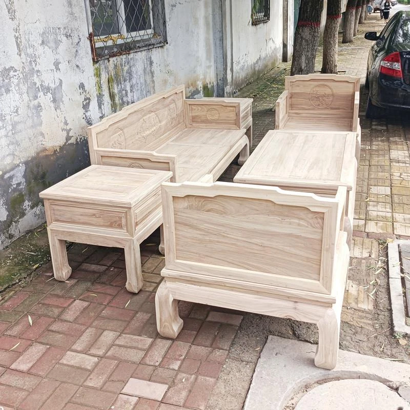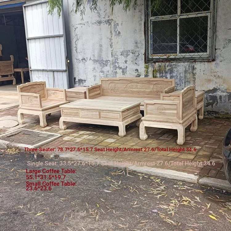 Classic Northern Elm Wood Chinese-Style Carved Sofa and Coffee Table Set for Living Room - Elegant Home Furniture in Natural Finish