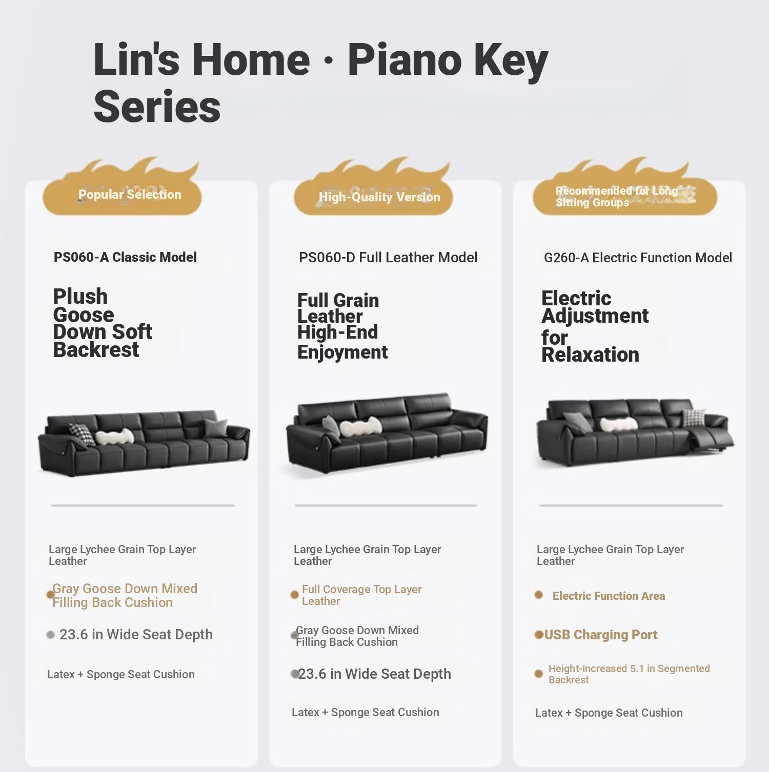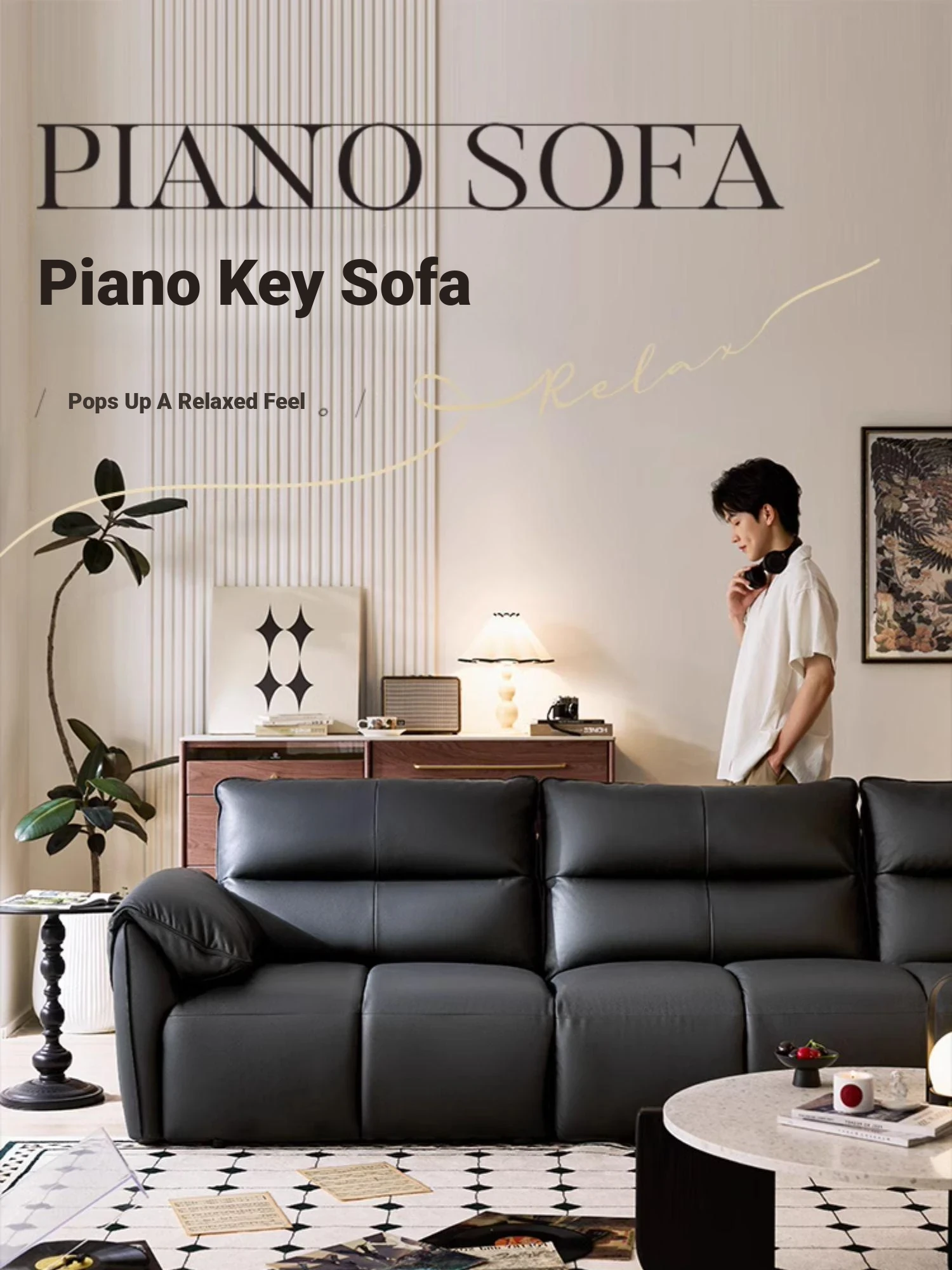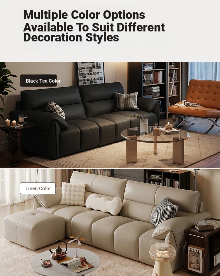 Lin's Home Black Genuine Leather Sofa - Stylish Piano Key Design for Living Room - 2024 New Arrival by Lin's Wood Industry