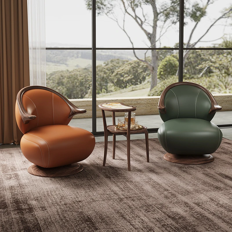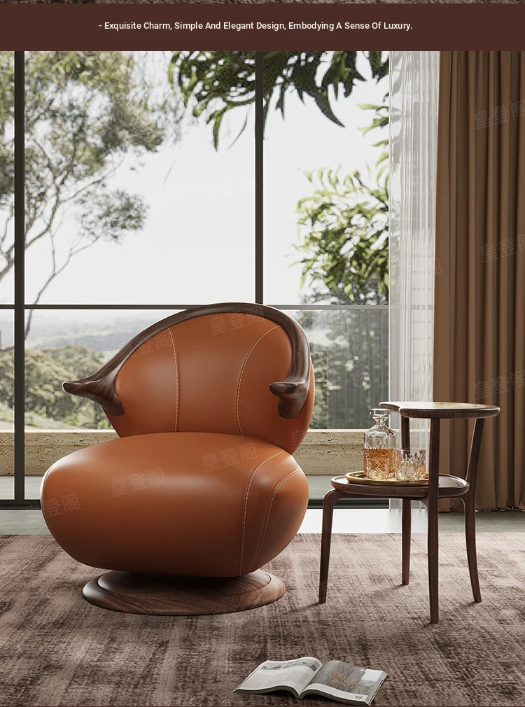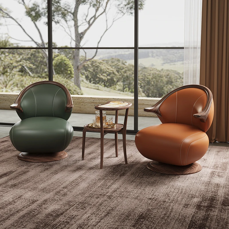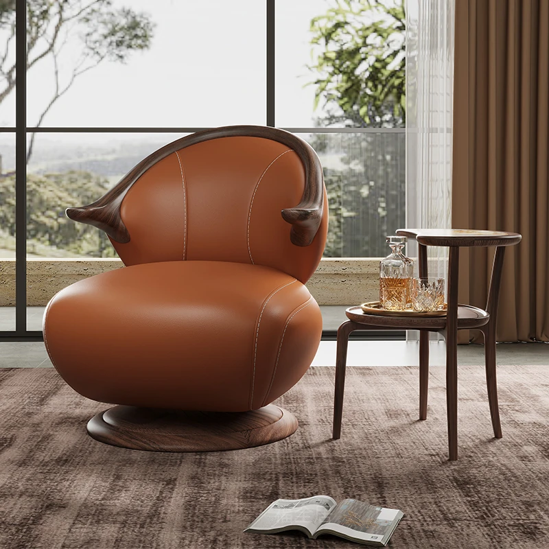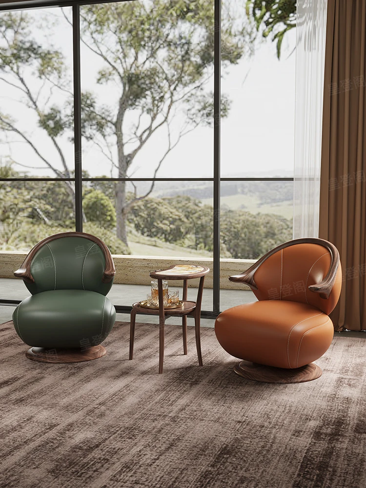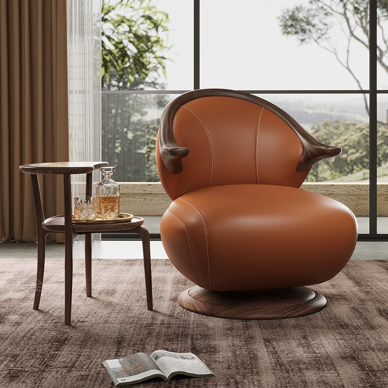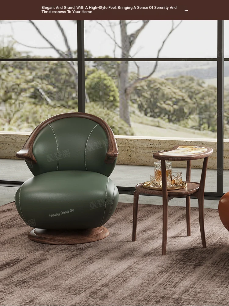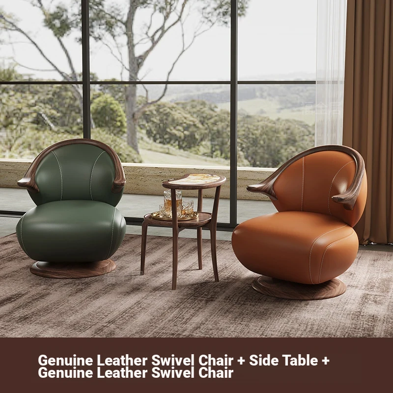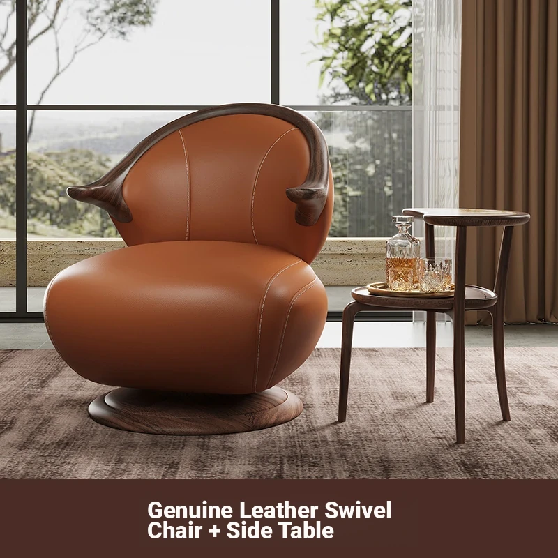 Modern Minimalist Black Walnut Solid Wood Genuine Leather Swivel Armchair - Stylish and Comfortable for Your Living Room, Perfect for Relaxation with Premium Cowhide Upholstery.
