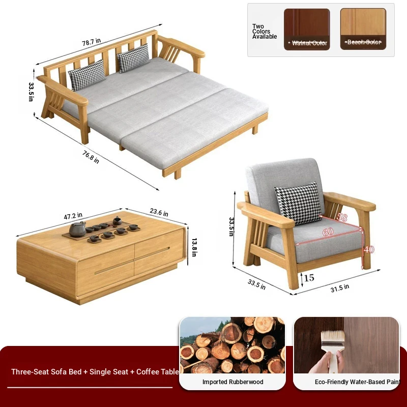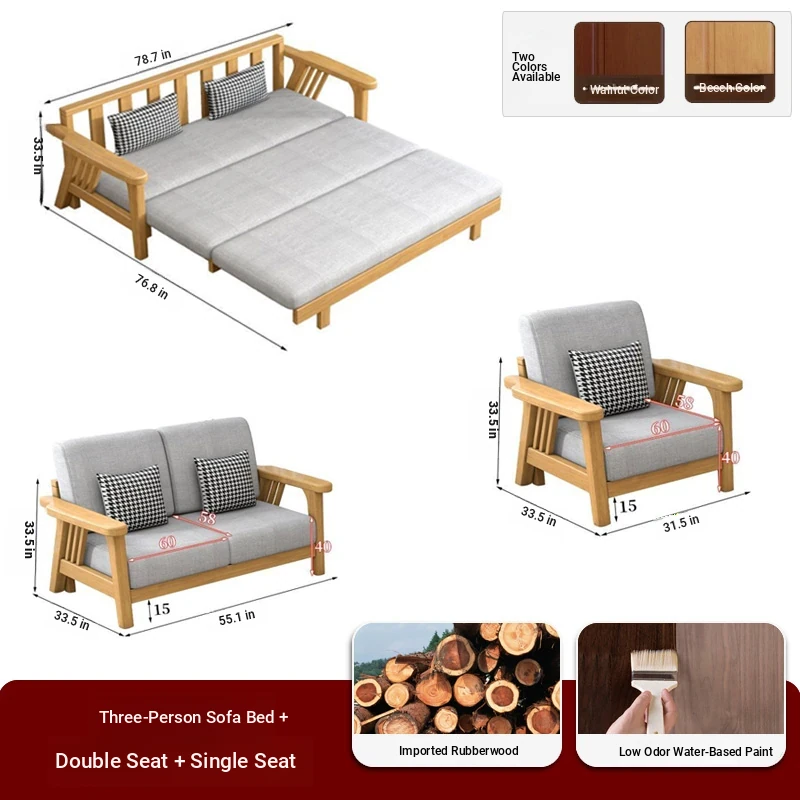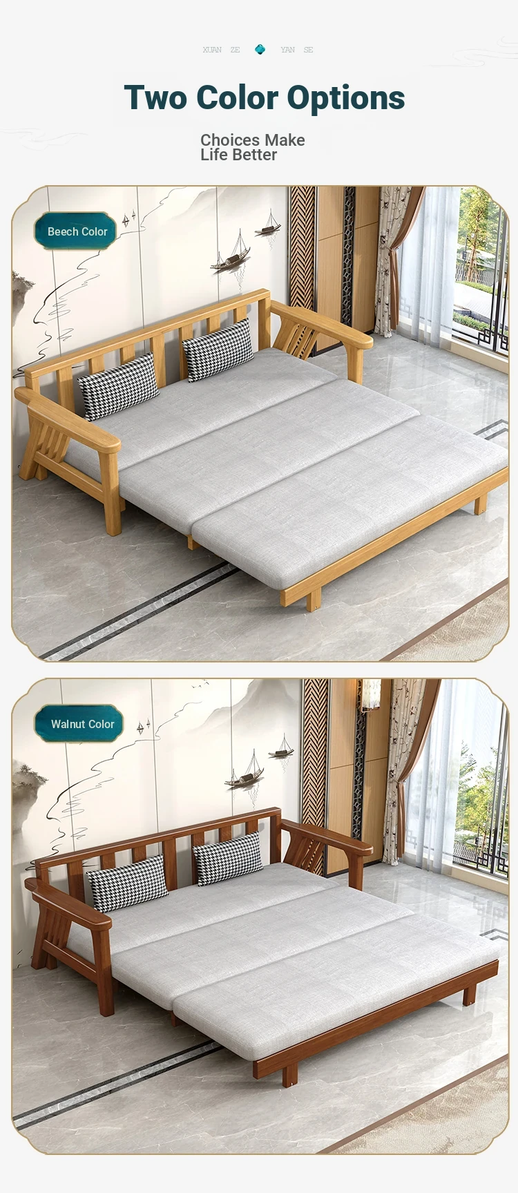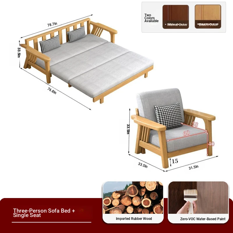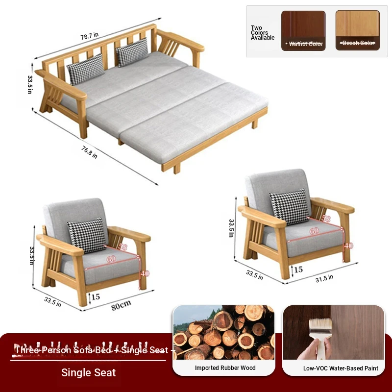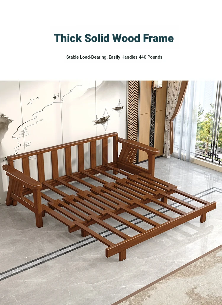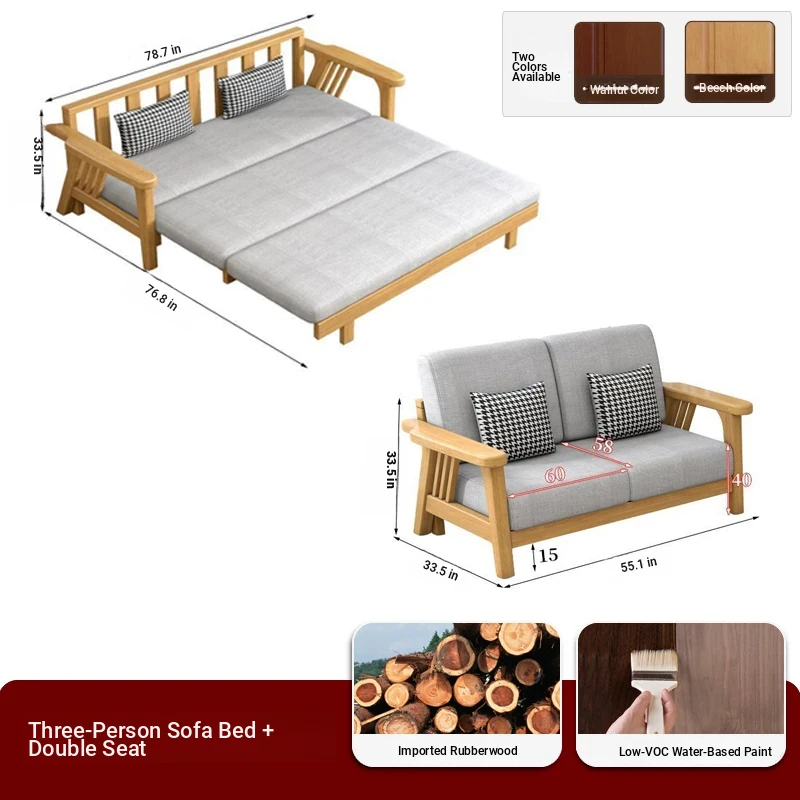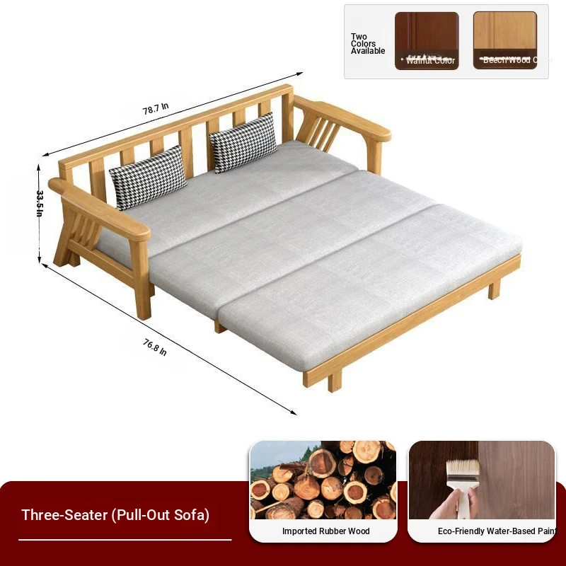 Multifunctional Folding Sofa Bed - Solid Wood Expandable and Convertible Design for Small Spaces, Natural Wood Pull-Out Bed, Perfect for Compact Living Areas