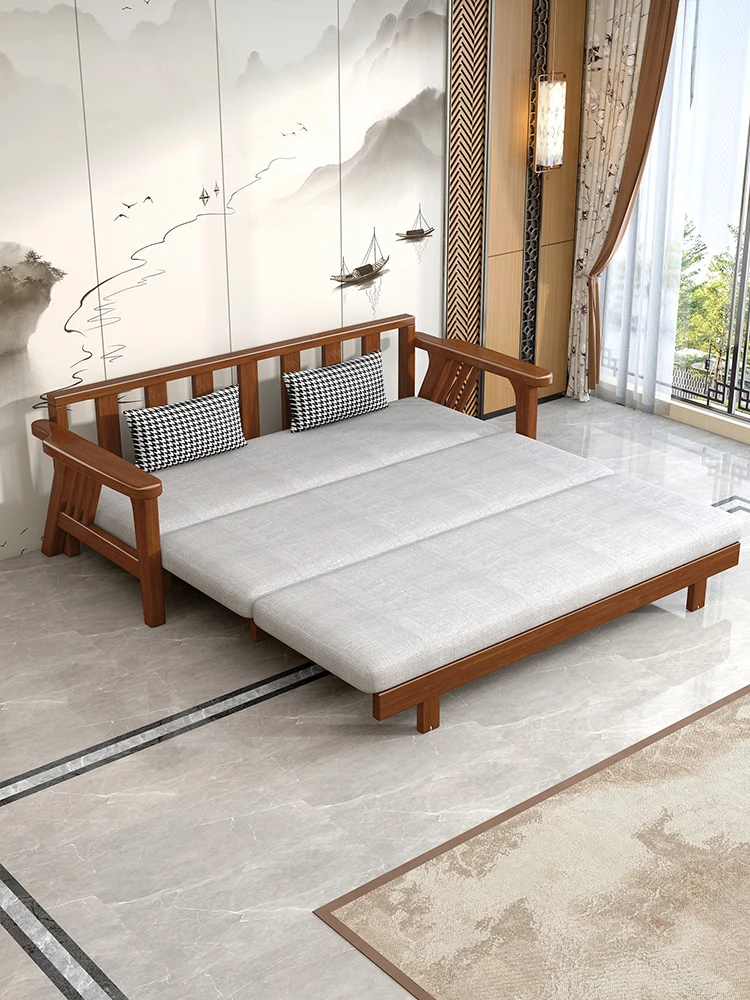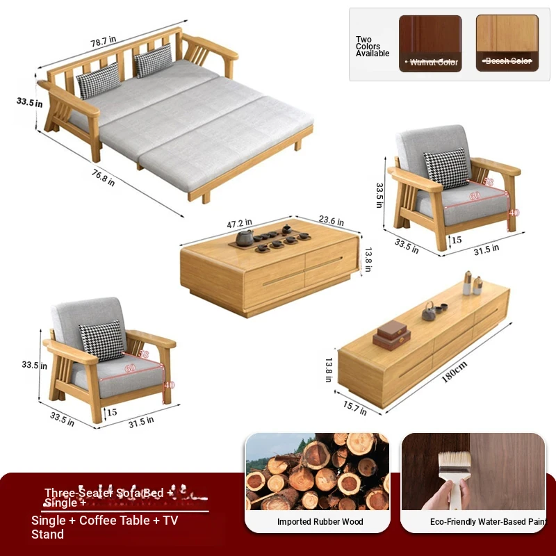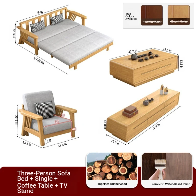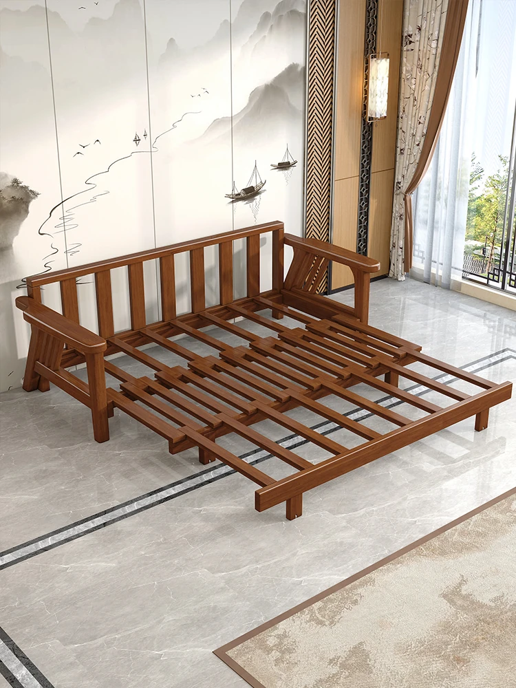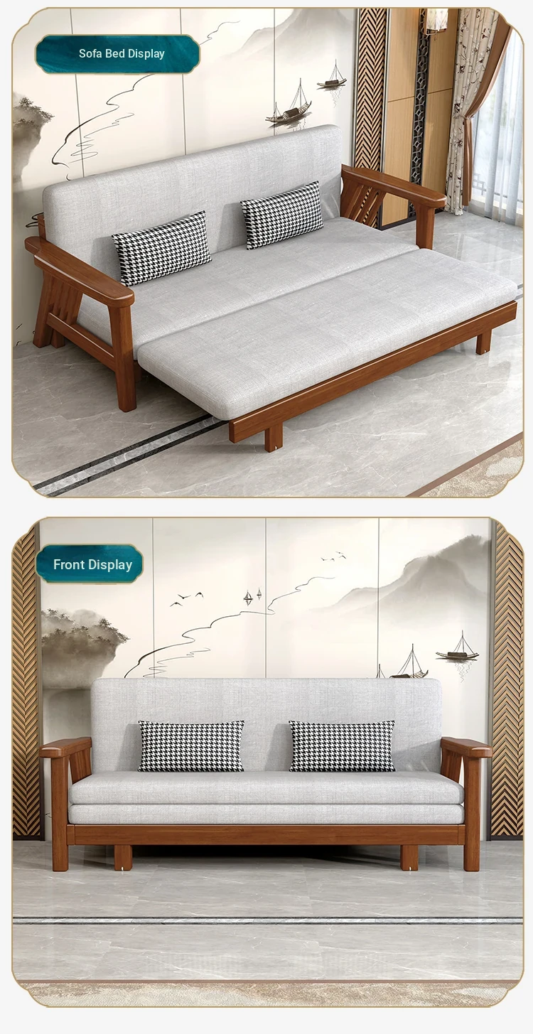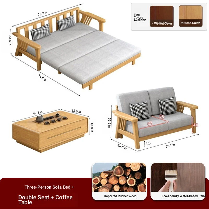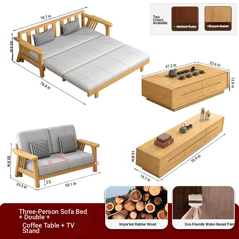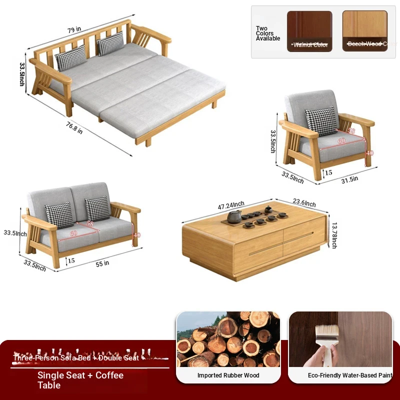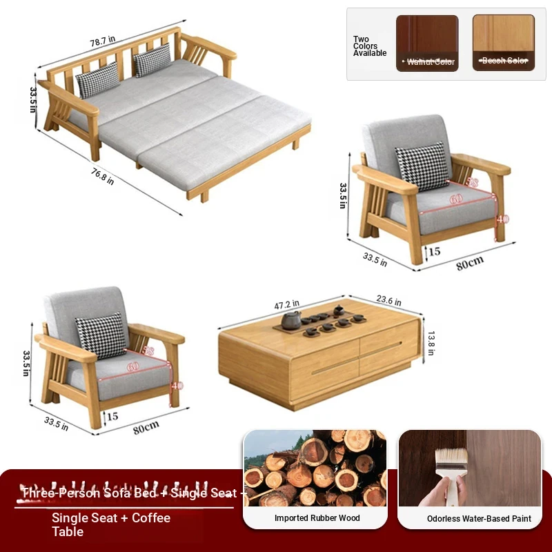Multifunctional Folding Sofa Bed - Solid Wood Expandable and Convertible Design for Small Spaces, Natural Wood Pull-Out Bed, Perfect for Compact Living Areas