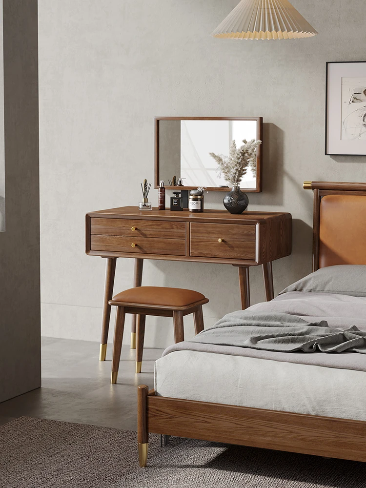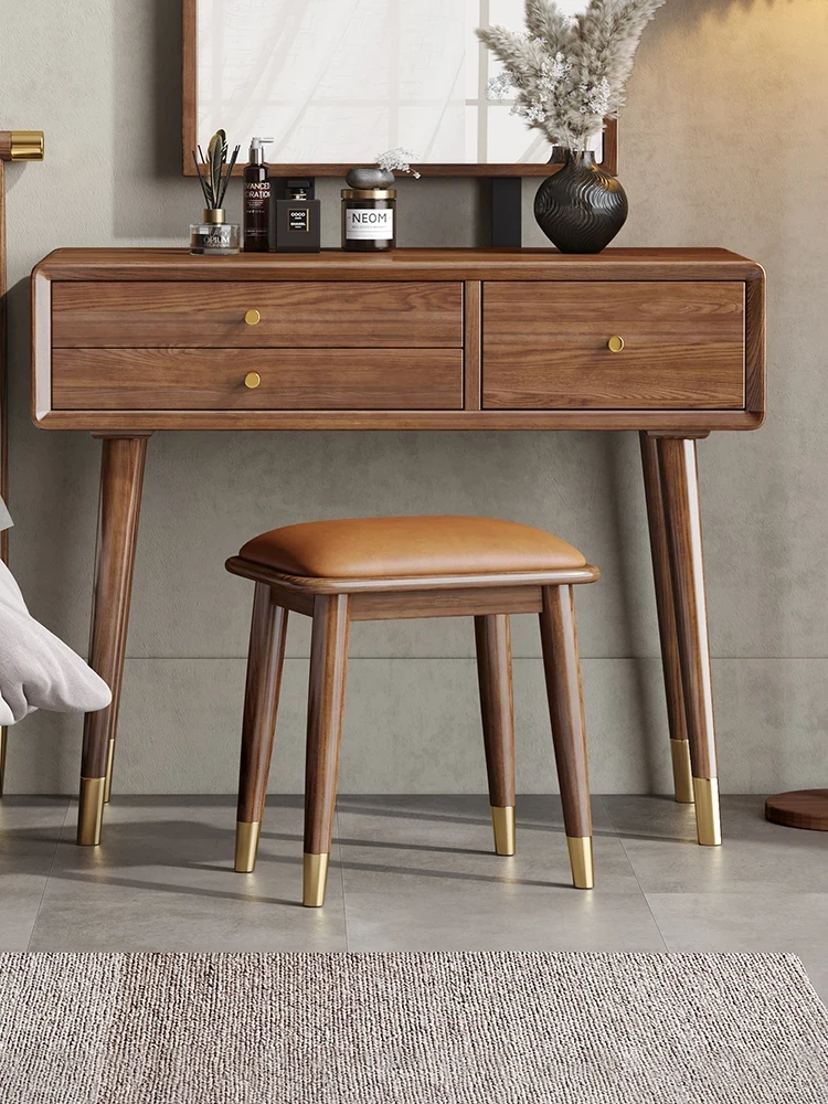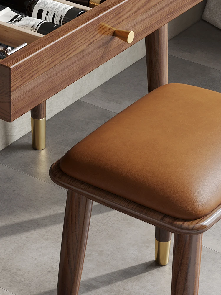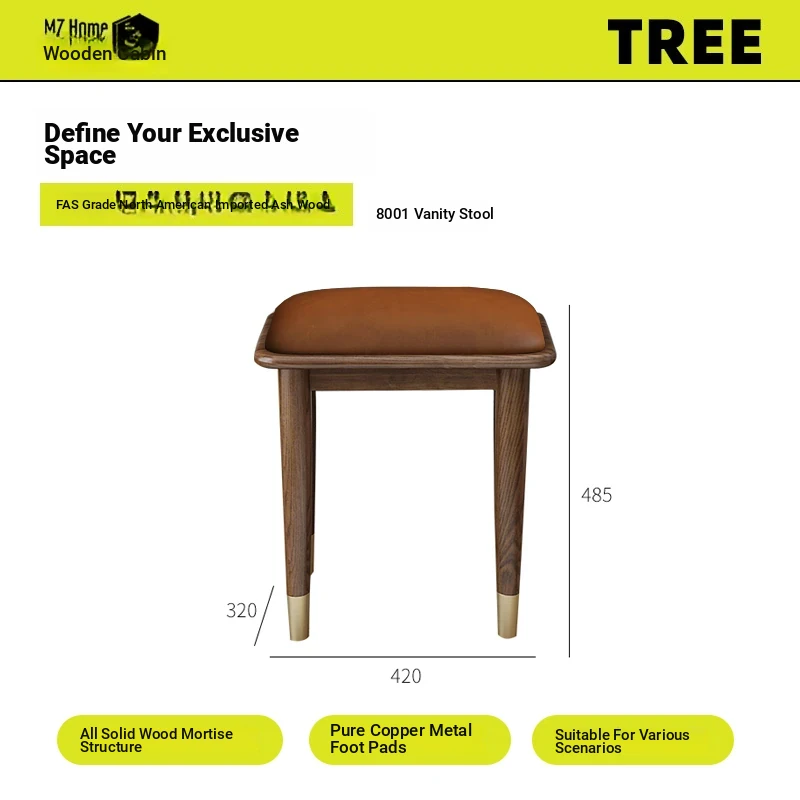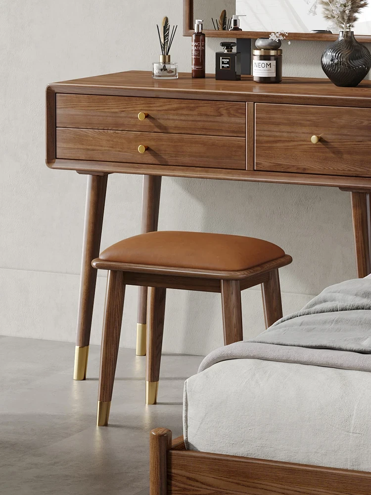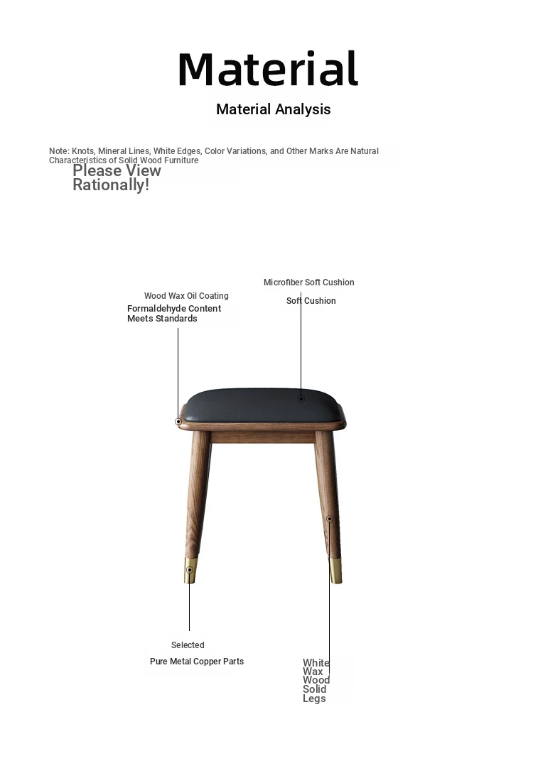 Nordic Minimalist Solid Wood Makeup Stool - Japanese Ash Wood Vanity Seat with Modern Luxury Walnut Veneer and Upholstered Design for Home Use