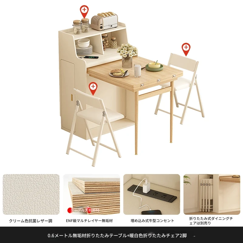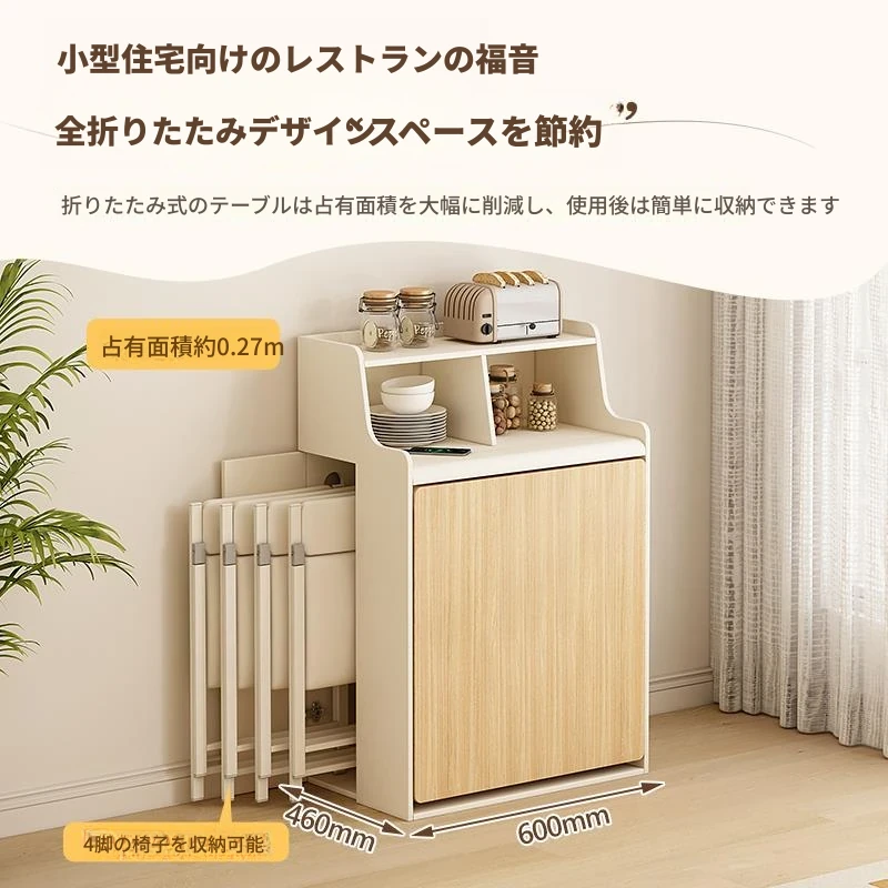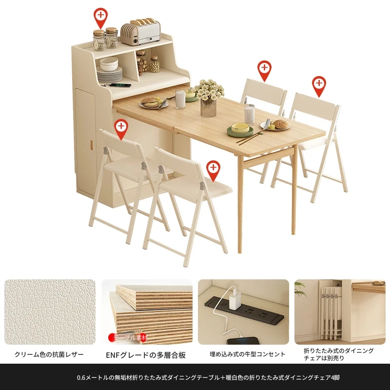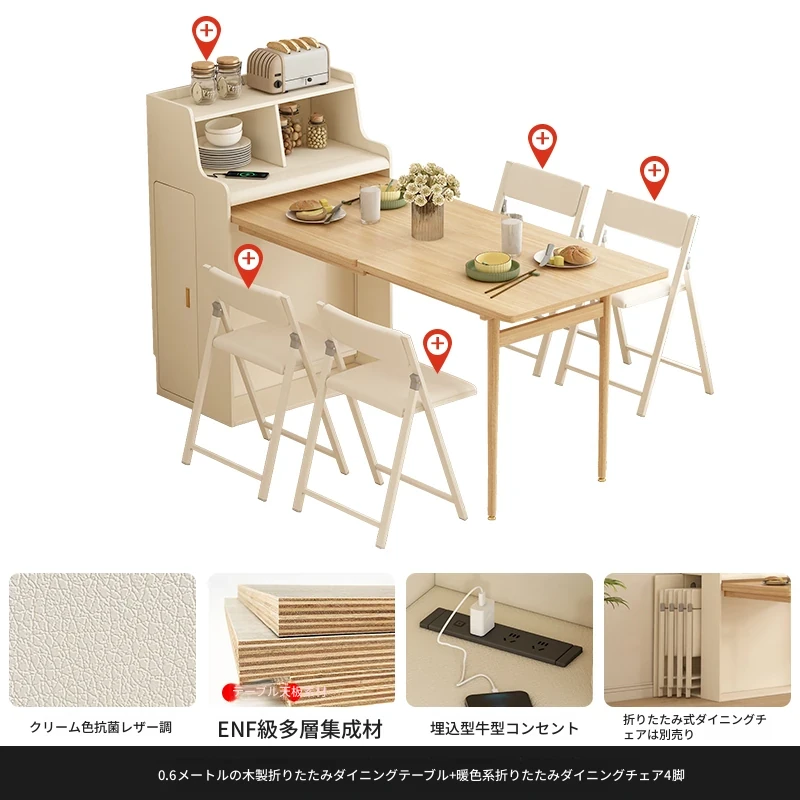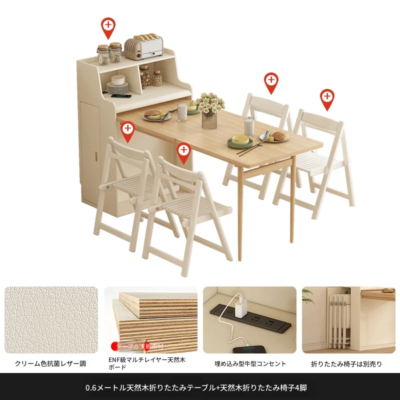 0.6メートル 無垢材折りたたみダイニングテーブル+暖白色折りたたみダイニングチェア*4