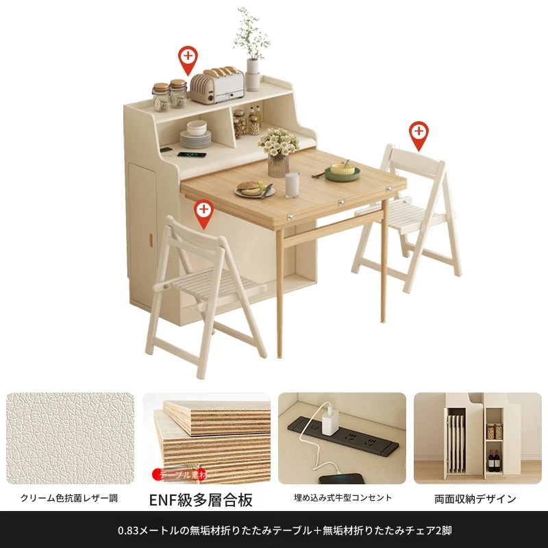 0.83メートル 無垢材折りたたみダイニングテーブル+暖白色折りたたみダイニングチェア*2