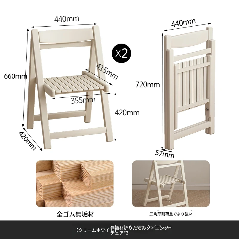 0.6メートル 無垢材折りたたみダイニングテーブル+暖白色折りたたみダイニングチェア*2