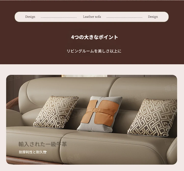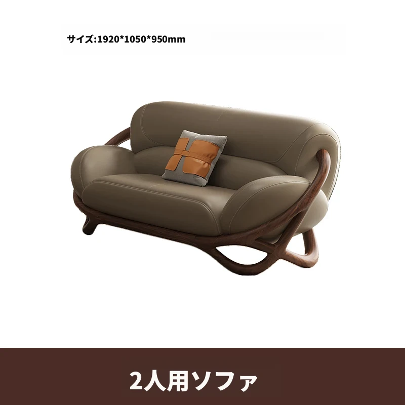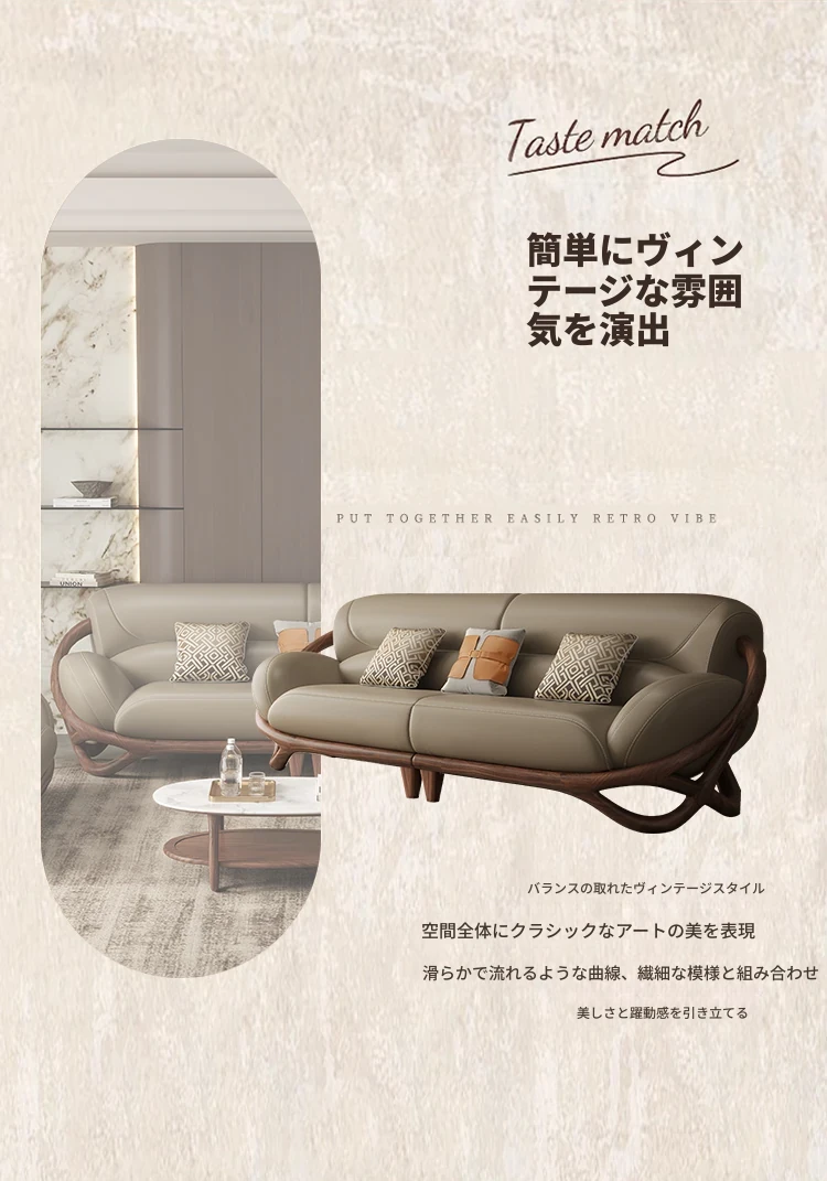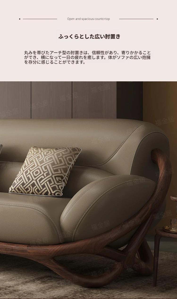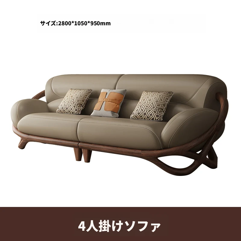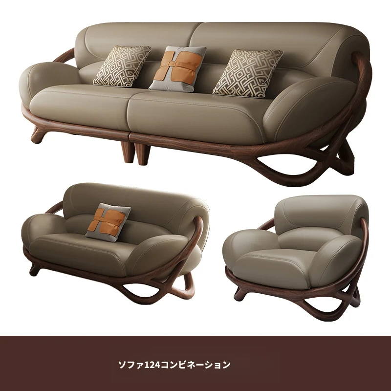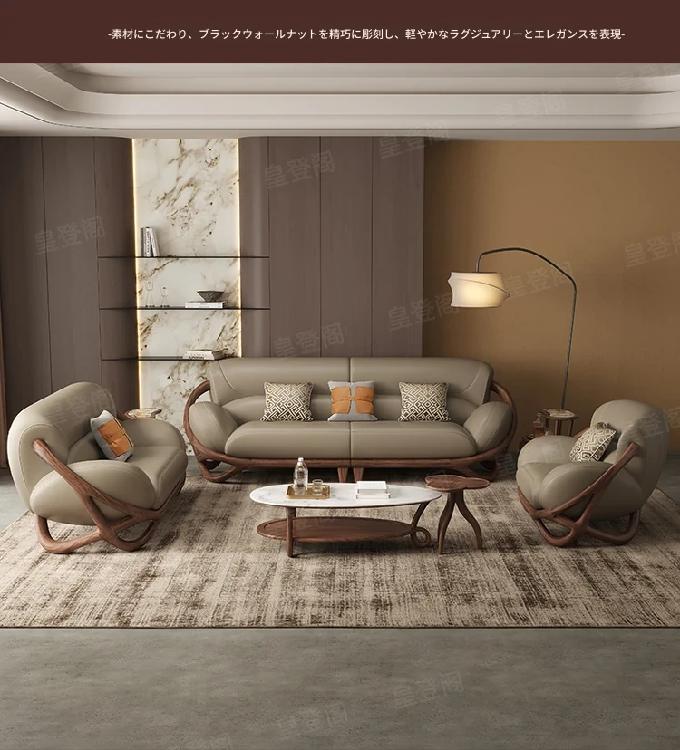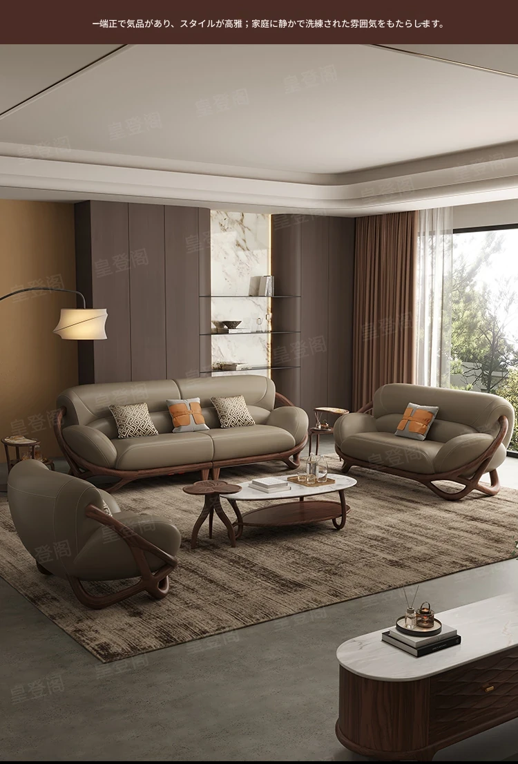 福全居新中式ブラックウォールナット無垢材レザーソファセット - モダンでシンプルなリビングにぴったりのウッディで高級感あふれるデザイン!快適な座り心地で、心安らぐ空間を演出します。