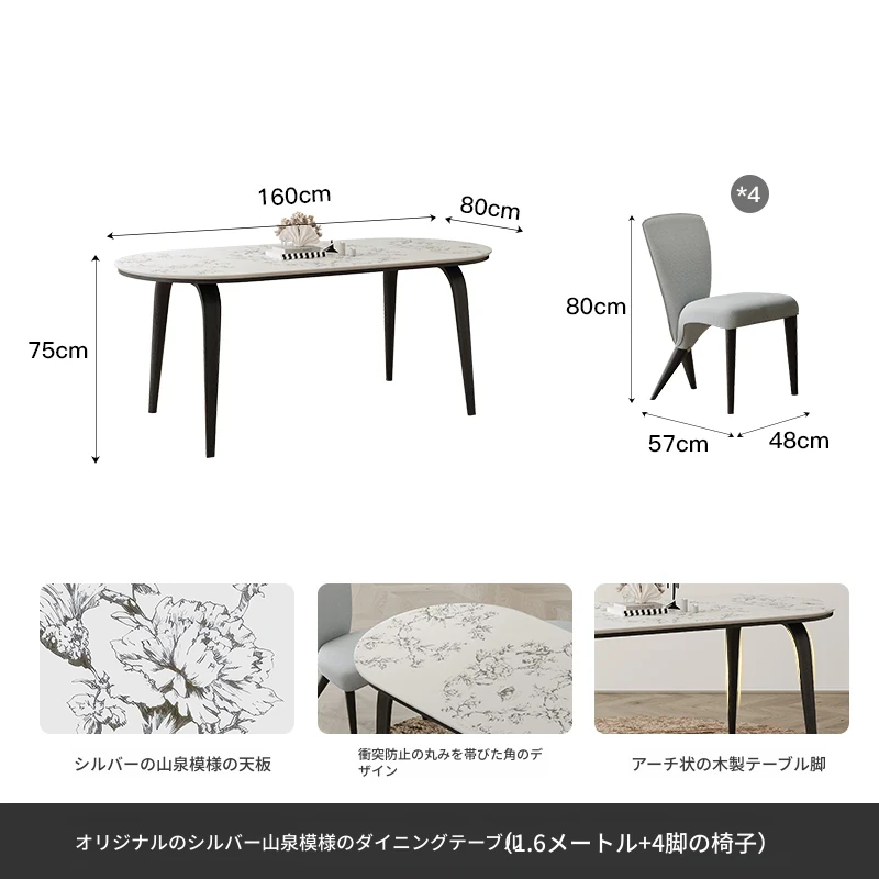 原版シルバー山泉模様ダイニングテーブル【1.6メートル+4脚の椅子】