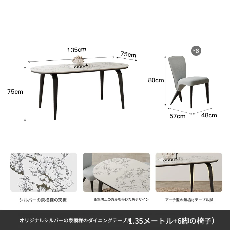 原版シルバー山泉模様ダイニングテーブル【1.35メートル+6脚の椅子】