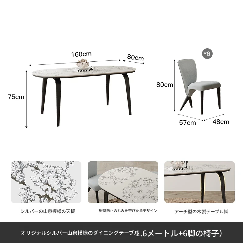 原版シルバー山泉模様ダイニングテーブル【1.6メートル+6脚の椅子】