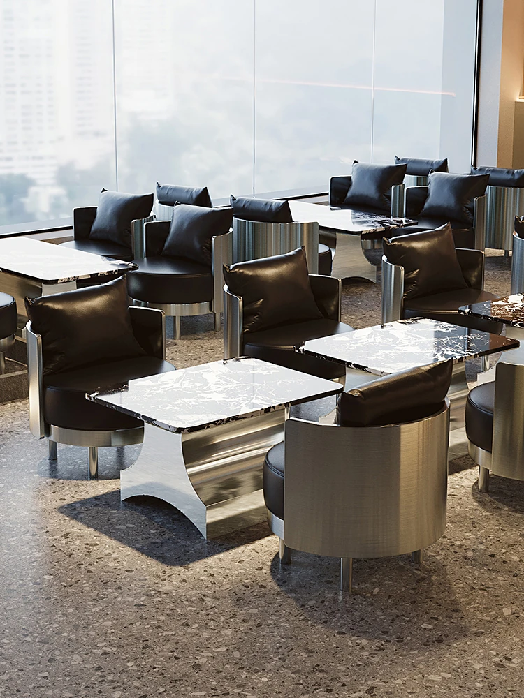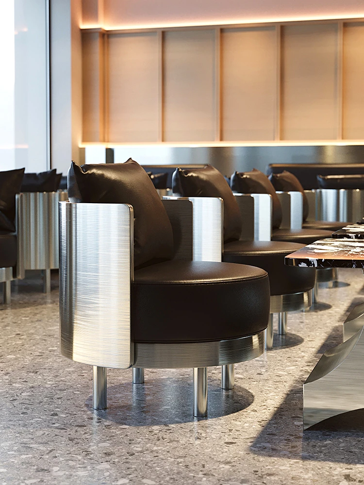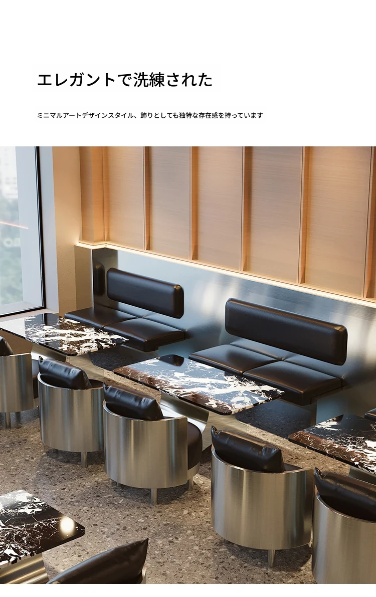 インダストリアルスタイルのカフェテーブル&チェアセット - バーやカフェに最適!おしゃれなソファチェアとステンレス製テーブルで、リラックスしたひとときを演出。お客様を惹きつける洗練されたデザイン!