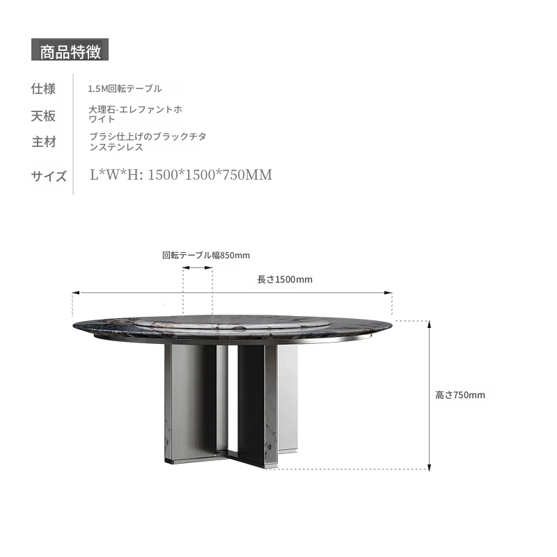 【天然大理石エレファントホワイト】1.50メートルダイニングテーブル(回転盤付き)