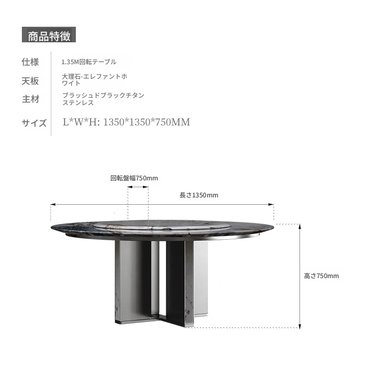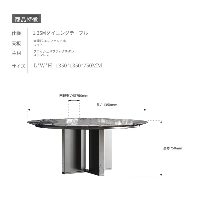 【天然大理石エレファントホワイト】1.35メートルダイニングテーブル(回転盤付き)