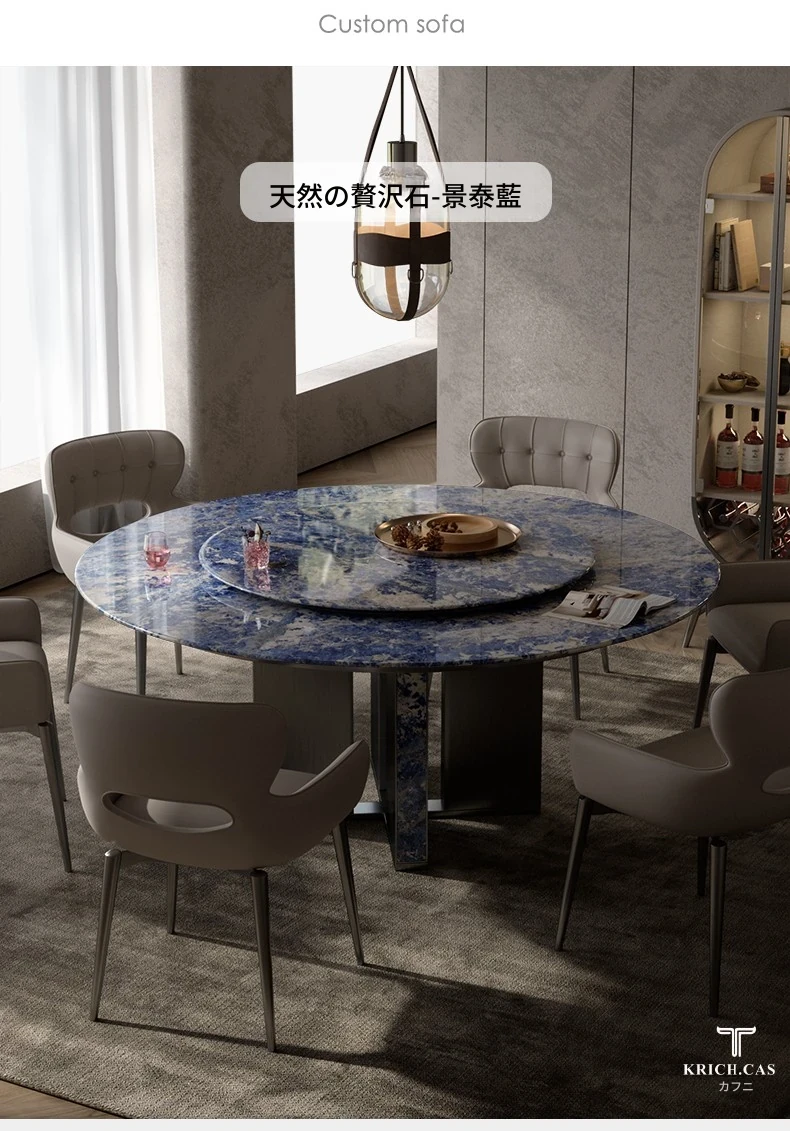高級感溢れるラグジュアリーな青いサファイアデザインの円形ダイニングテーブル - 天然大理石使用、モダンでシンプルな別荘向けレストラン家具。おしゃれな空間を演出します!