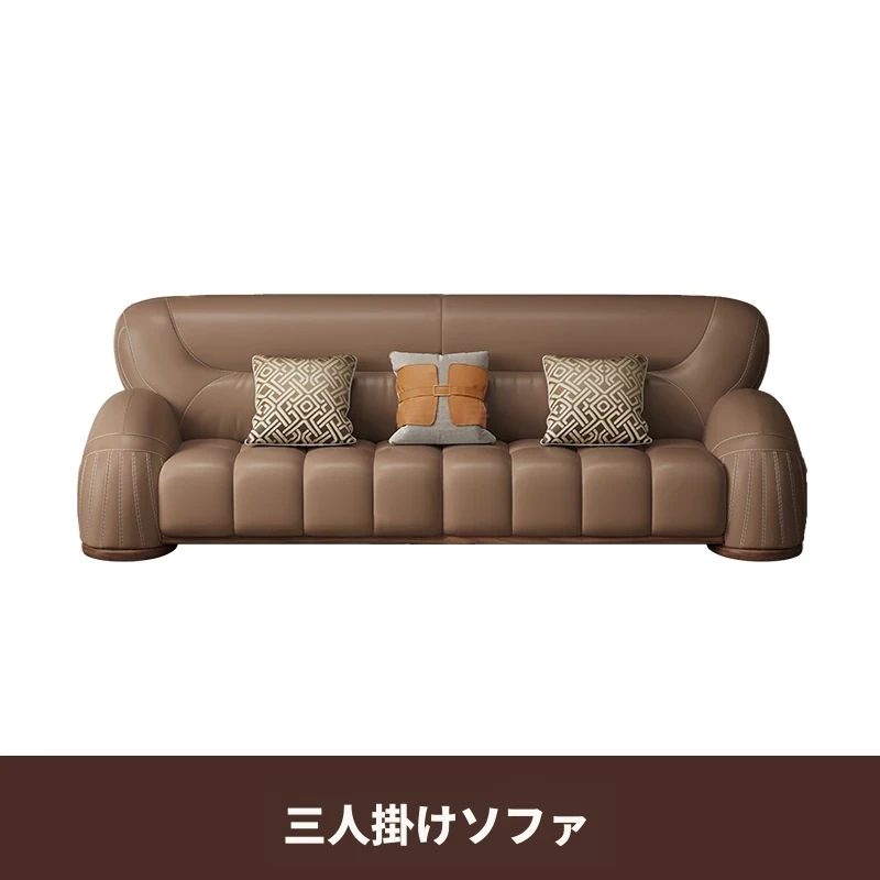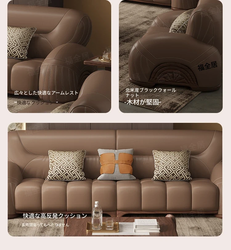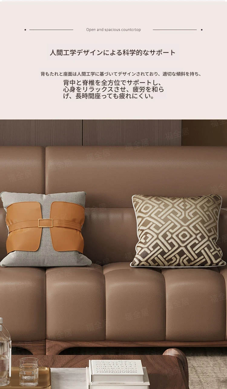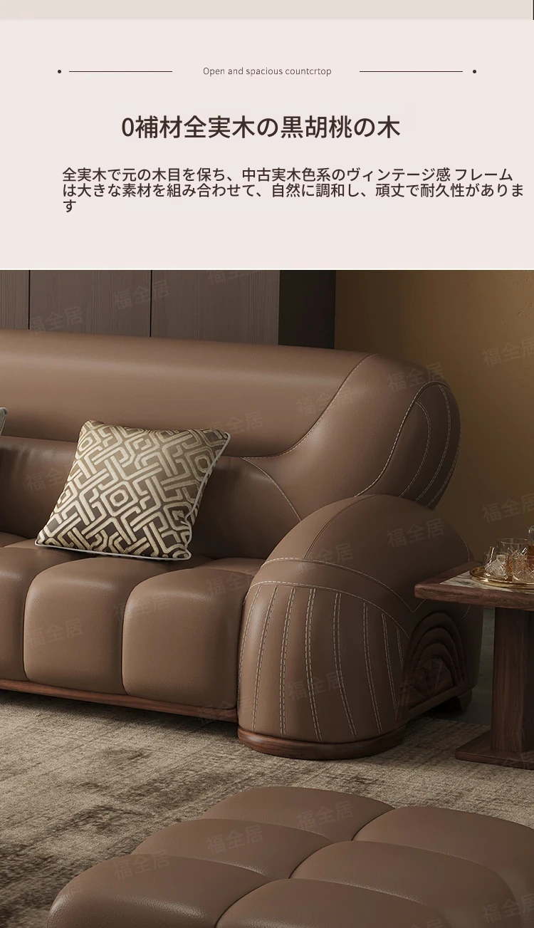 新中式デザインのブラックウォールナット無垢材使用!高品質本革製のストレートソファセット、モダンでシンプルなリビングに最適なウッディーな4人掛けソファ。贅沢な座り心地で、心安らぐ空間を演出します。