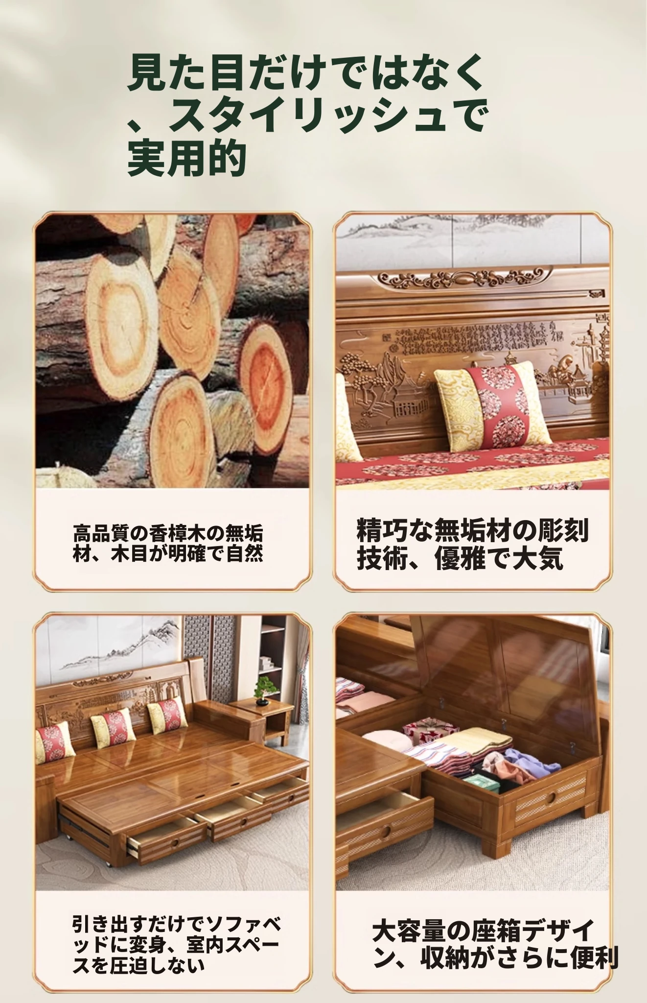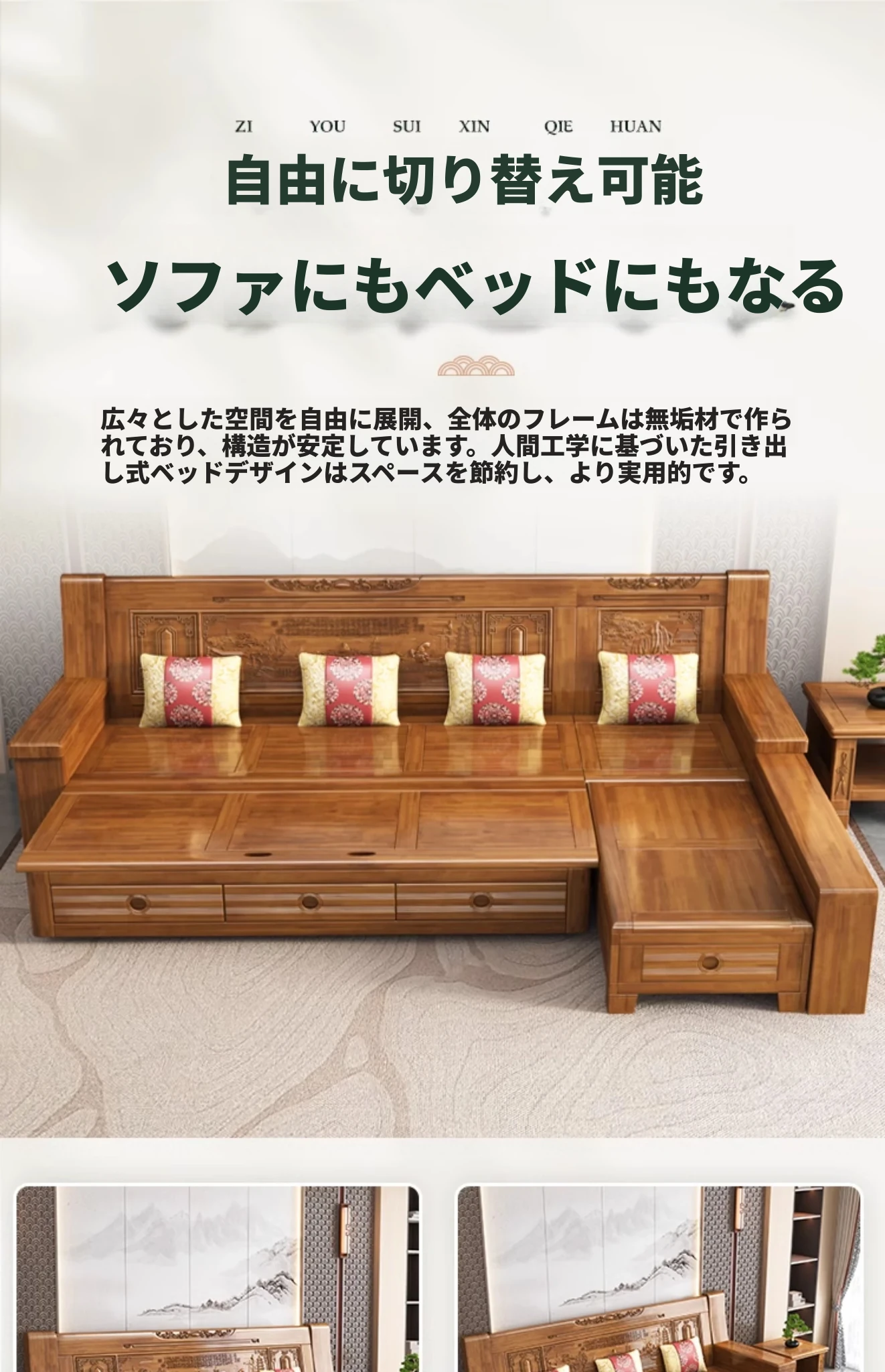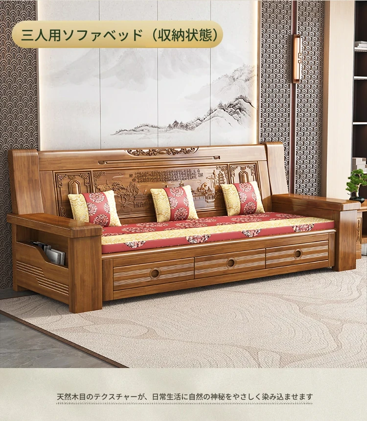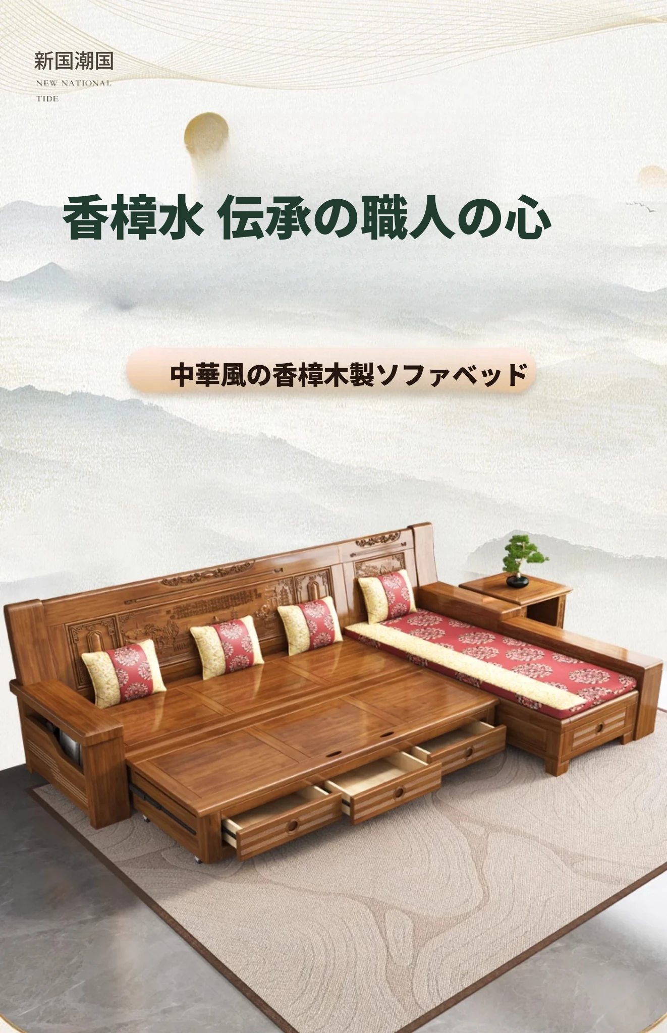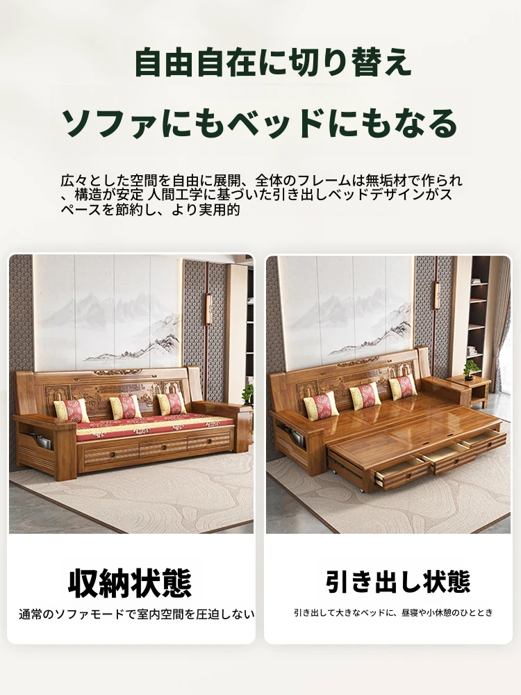 実木製ソファベッド 折りたたみ式 二用途 リビング 小型住宅向け 中式モダン ストレージ機能付き 香樟木製 伸縮式ソファベッドで快適な空間を実現!