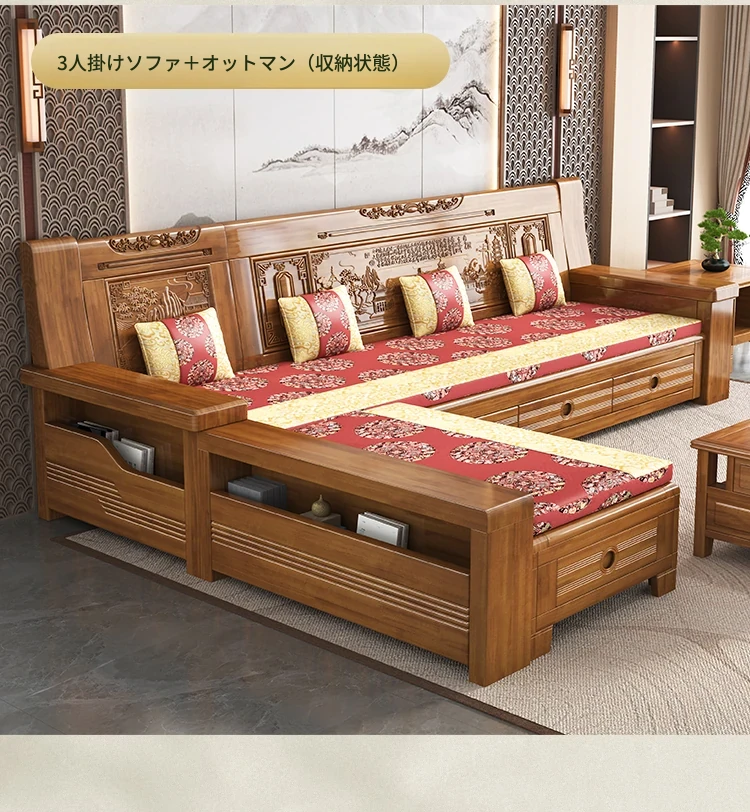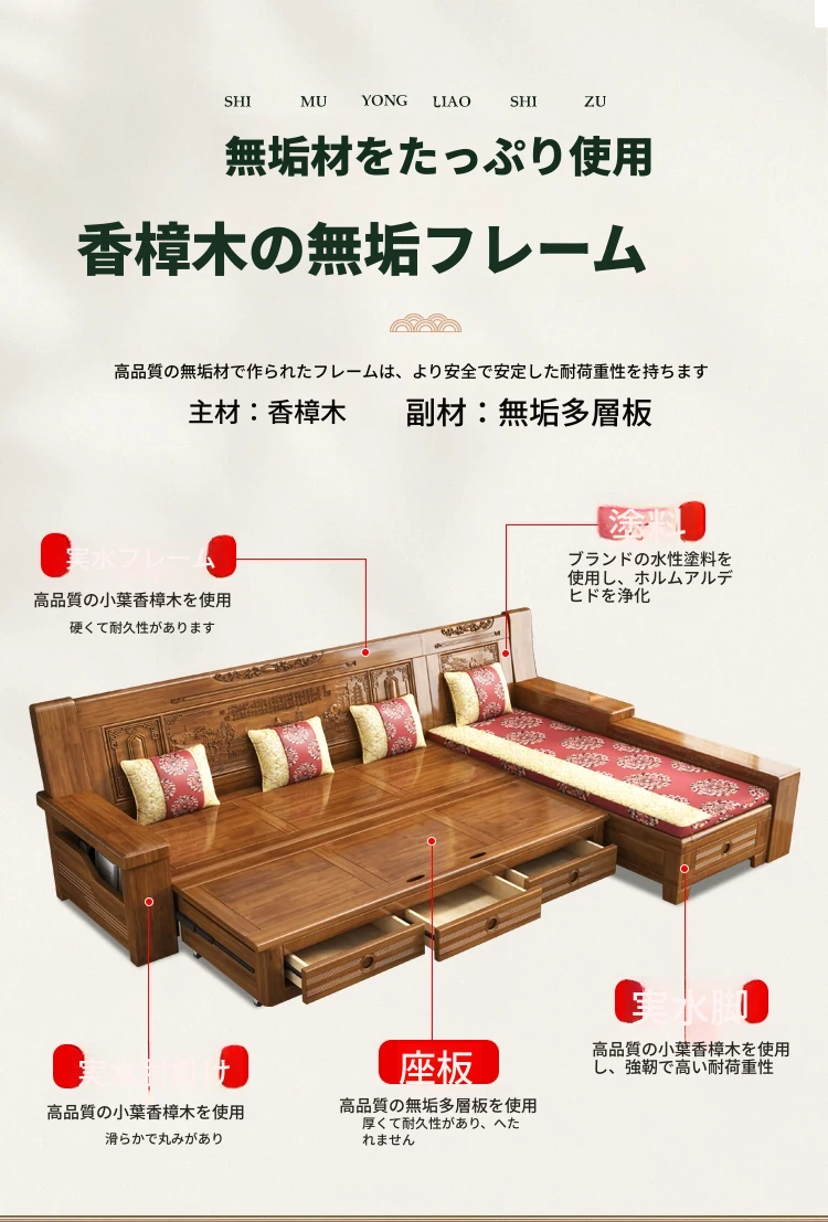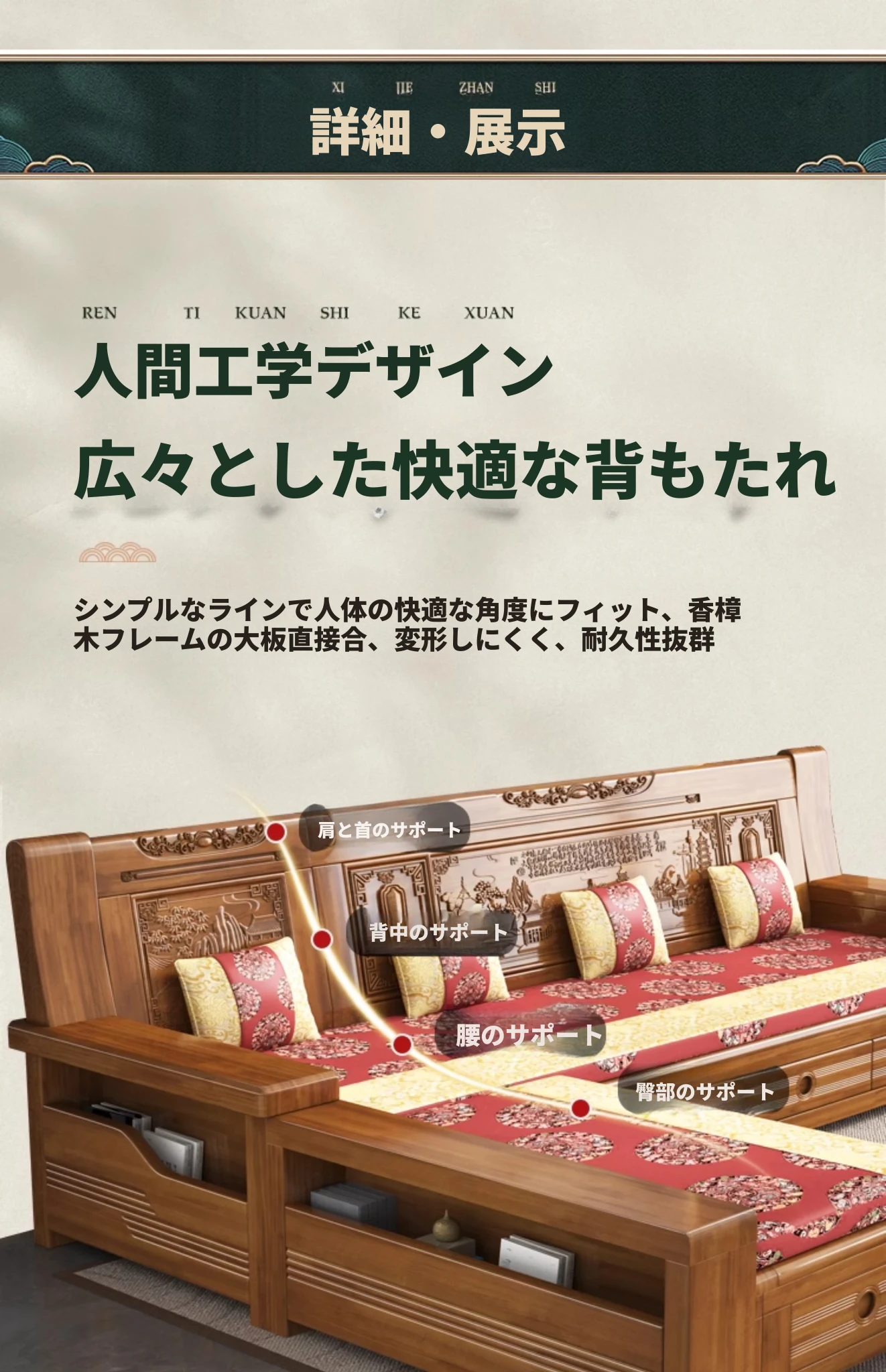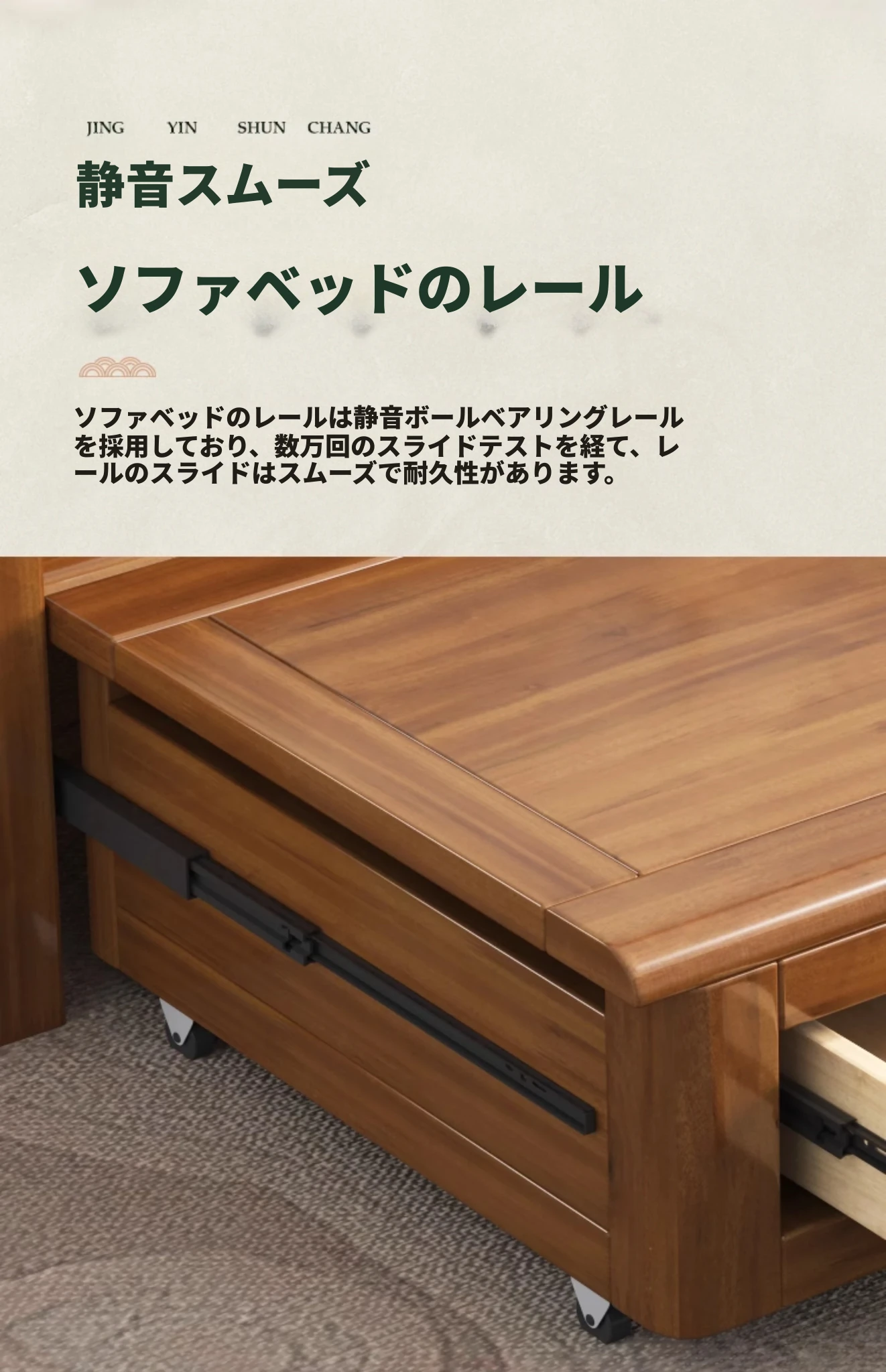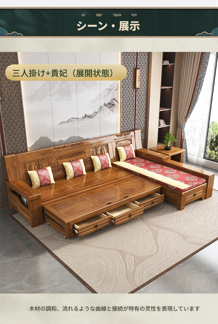 実木製ソファベッド 折りたたみ式 二用途 リビング 小型住宅向け 中式モダン ストレージ機能付き 香樟木製 伸縮式ソファベッドで快適な空間を実現!