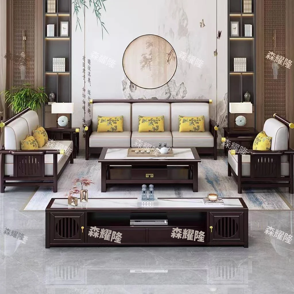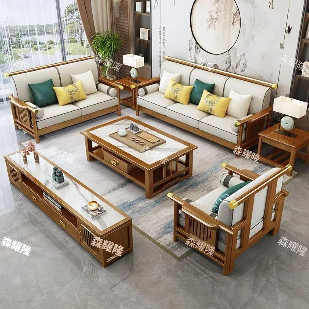 新スタイルの中華風リビングルーム用ソファセット - 現代的なデザインと伝統的な禅のエッセンスを融合した4人用木製家具。贅沢なヴィラにぴったりな35678シリーズで、心地よい空間を演出します。