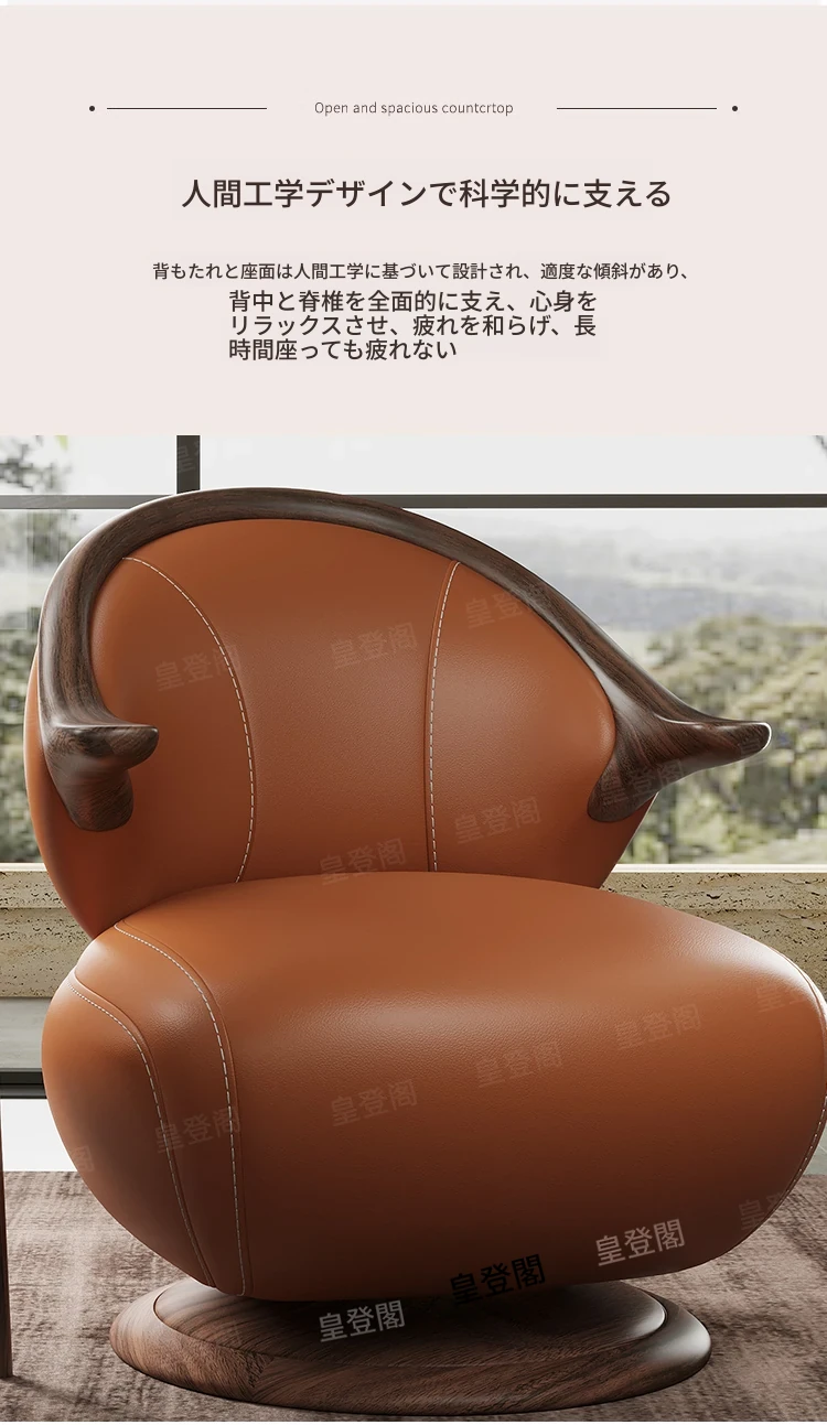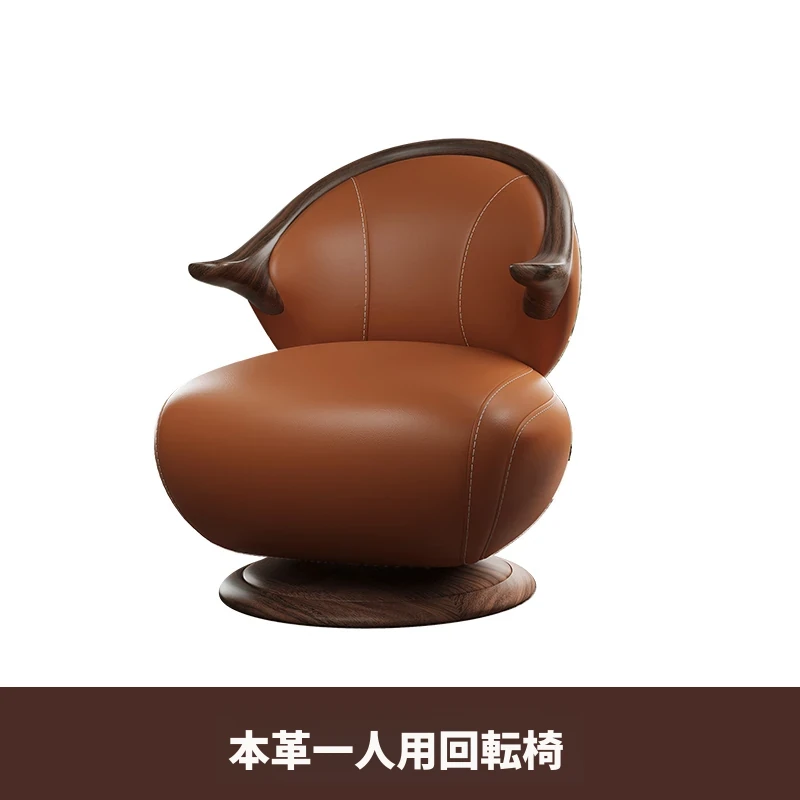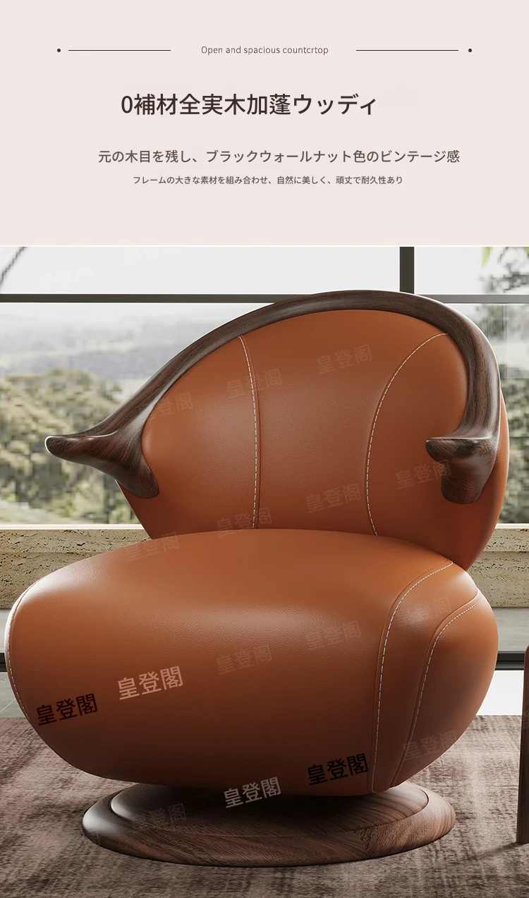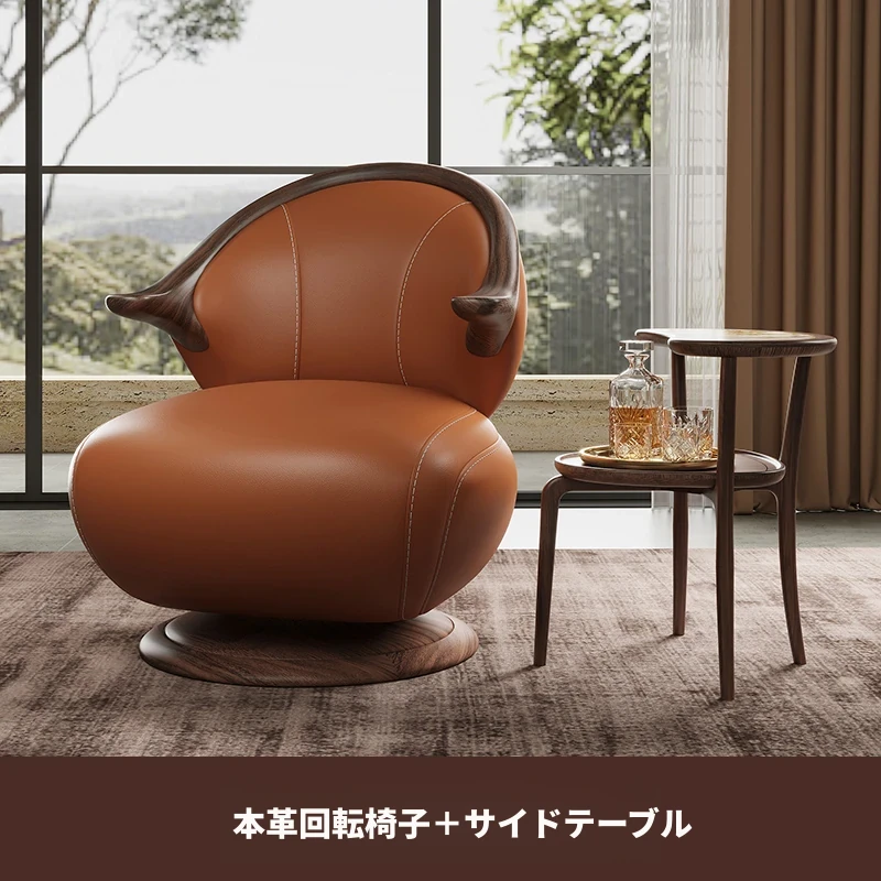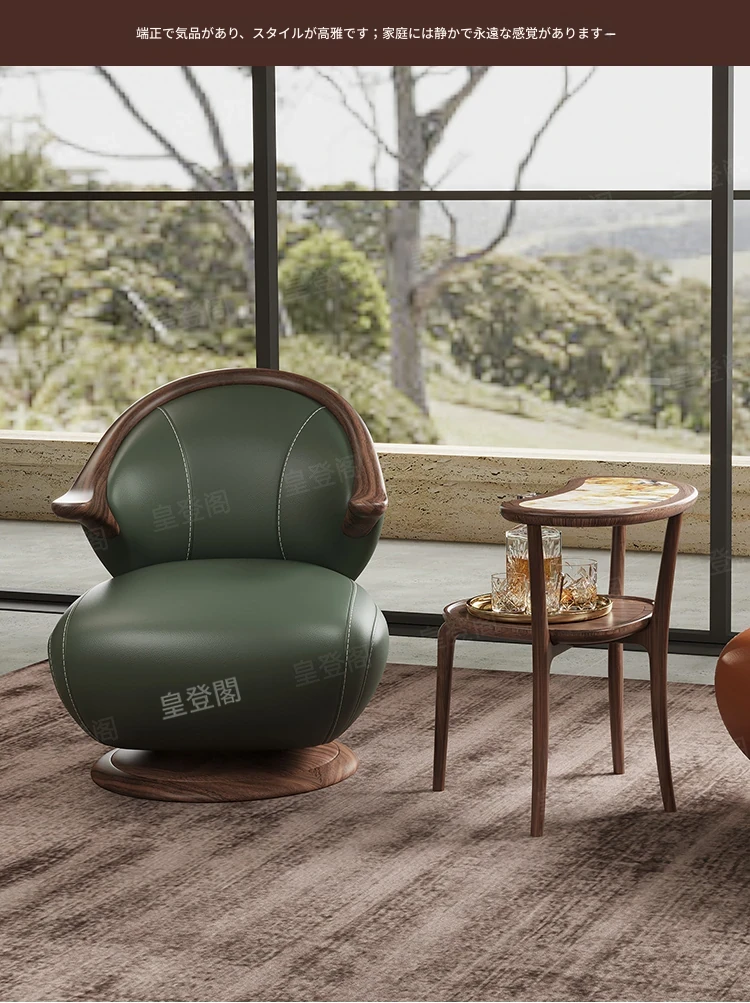新中式黒胡桃木無垢材真皮単人回転ソファチェア|現代的でシンプルなデザイン|リビングにぴったりな高級牛皮使用の快適なリラックス空間を演出!