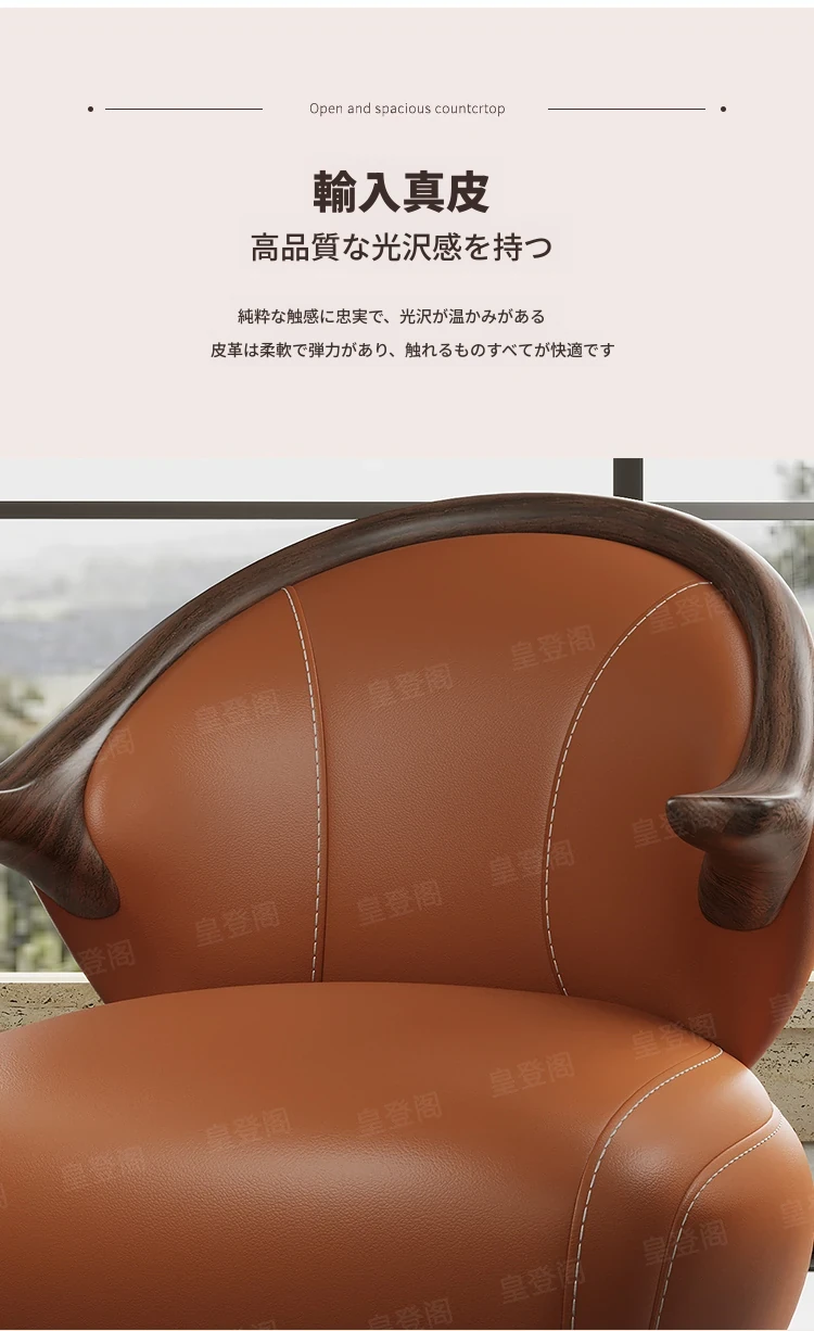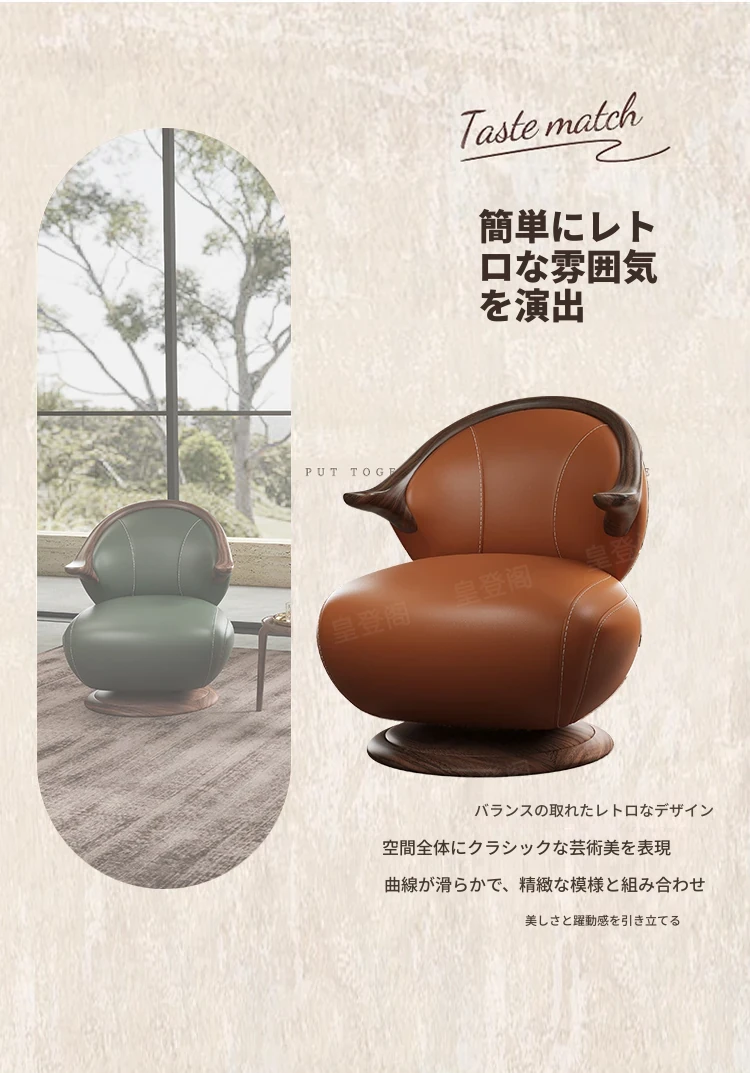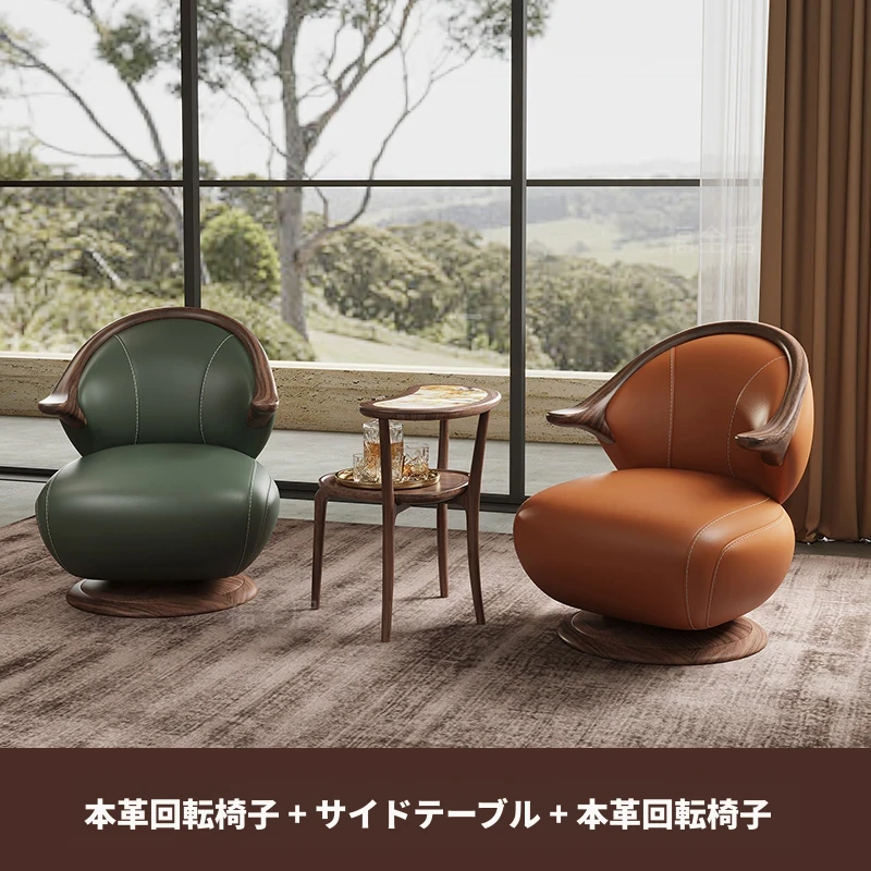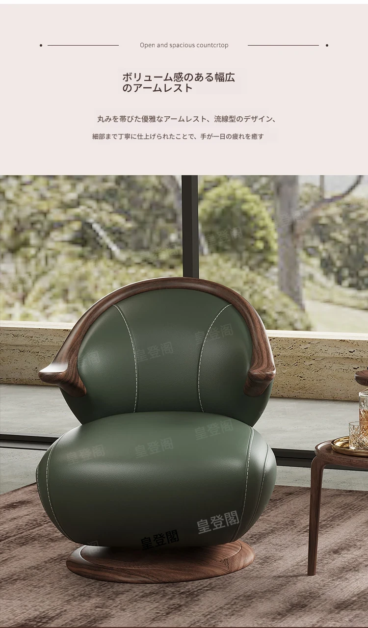 新中式黒胡桃木無垢材真皮単人回転ソファチェア|現代的でシンプルなデザイン|リビングにぴったりな高級牛皮使用の快適なリラックス空間を演出!