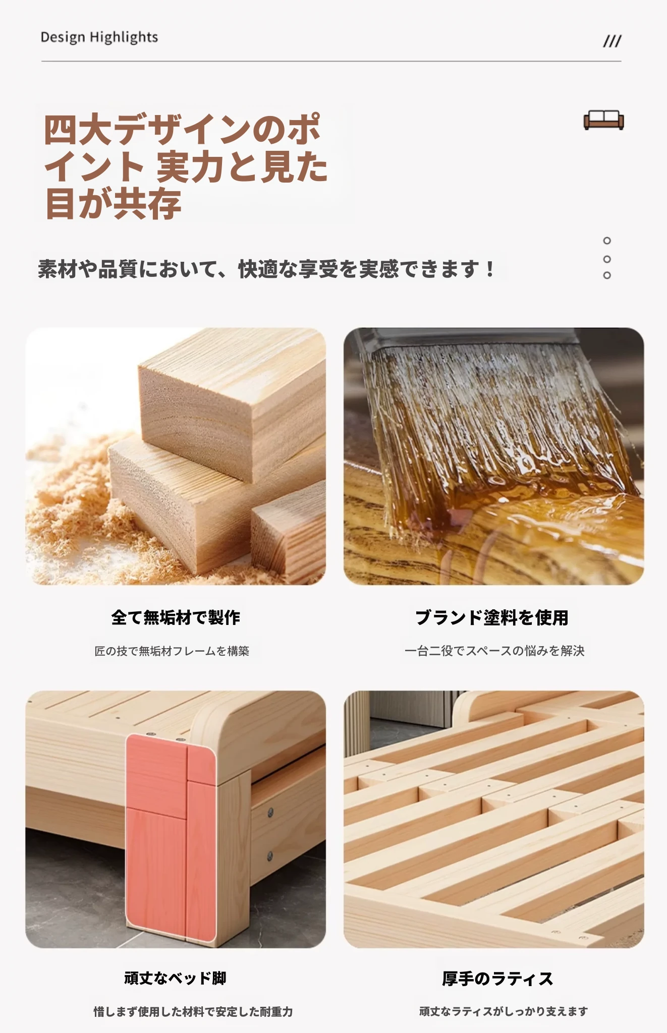 ナチュラルウッド幅1.5メートル引き出し197マットレスクッションプレゼント