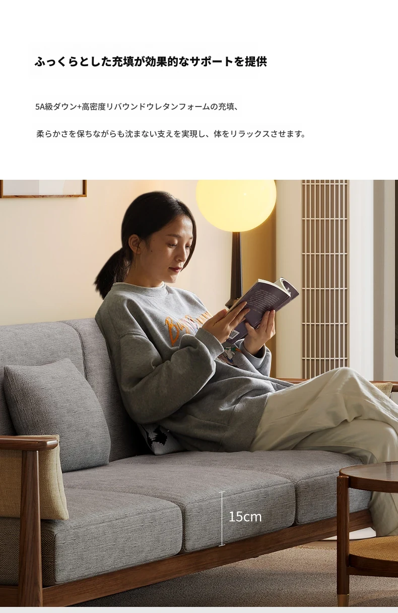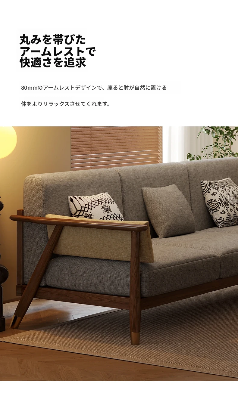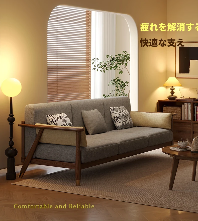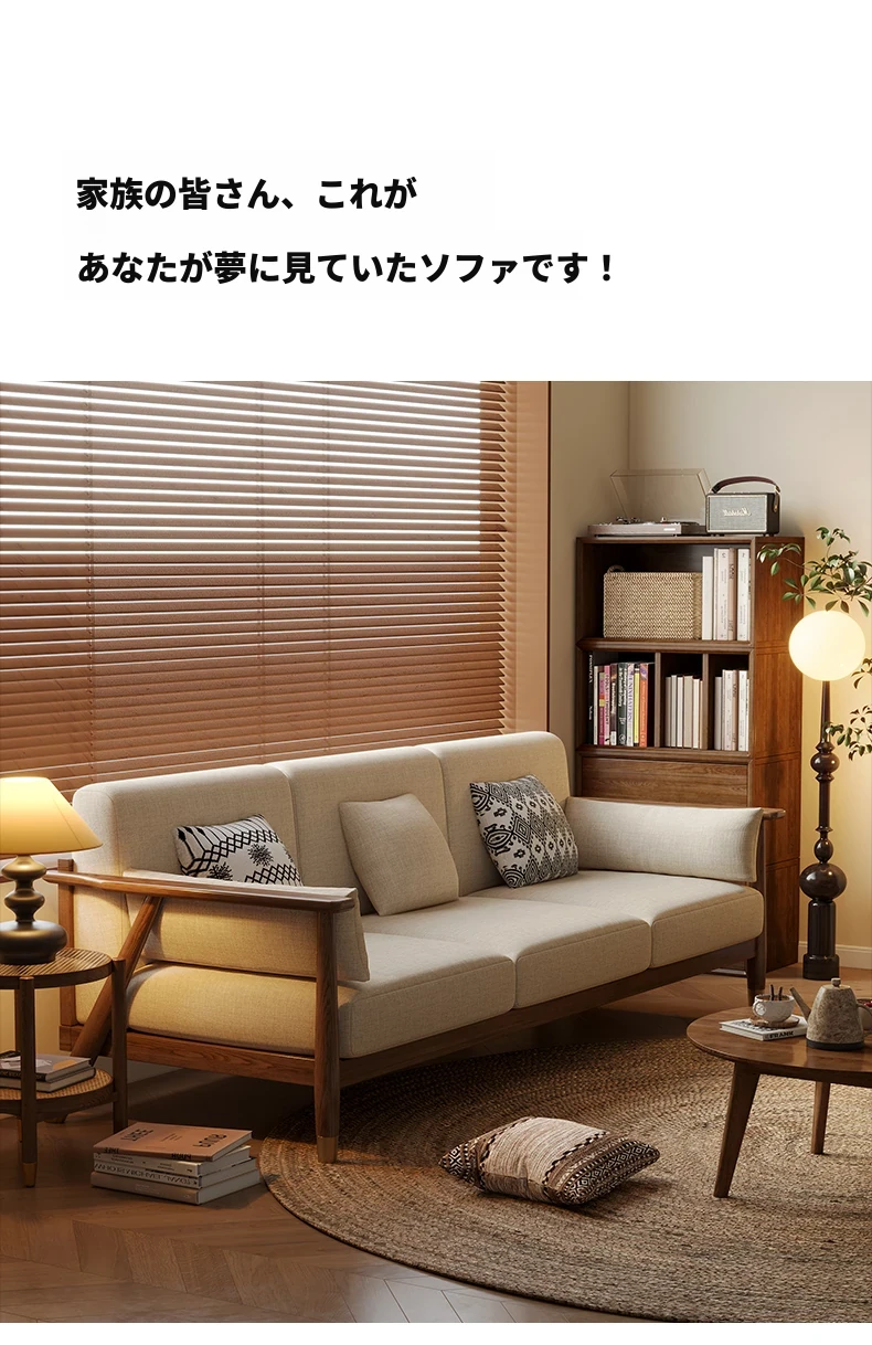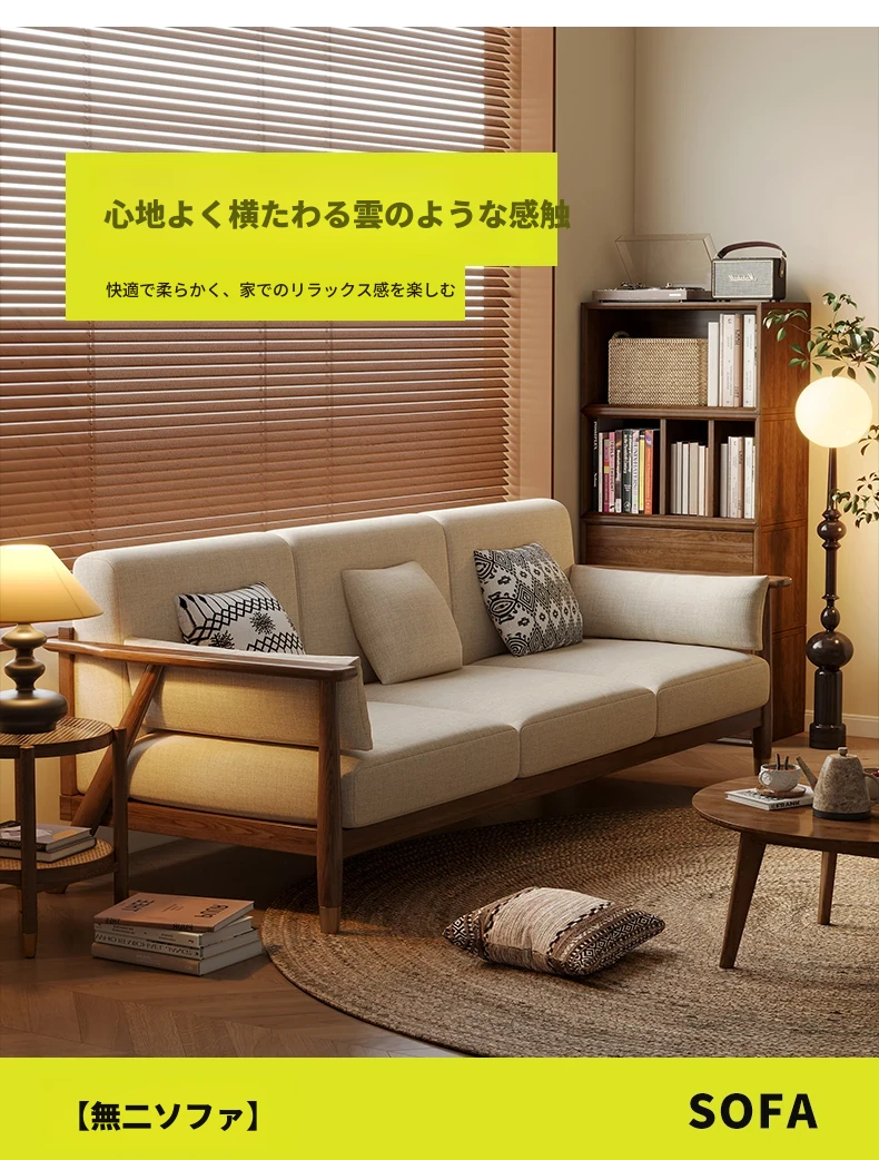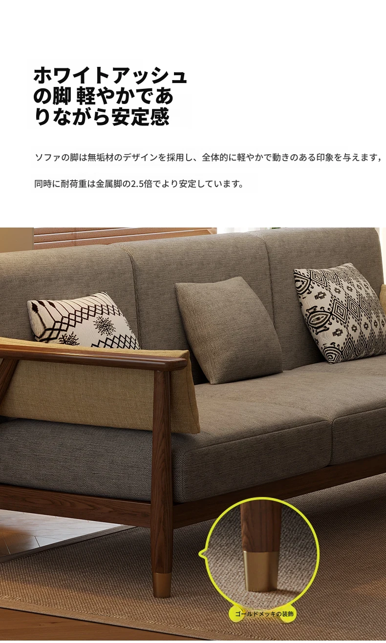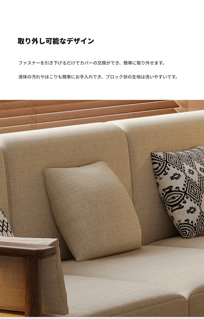 北欧スタイルのコットンリネンファブリックソファ、無垢材使用!黒ウォールナット色とホワイトアッシュのシンプルデザインで、リビングルームに新しい中華風の魅力をプラス。快適さと美しさを兼ね備えた理想的な組み合わせ!