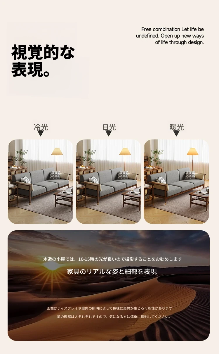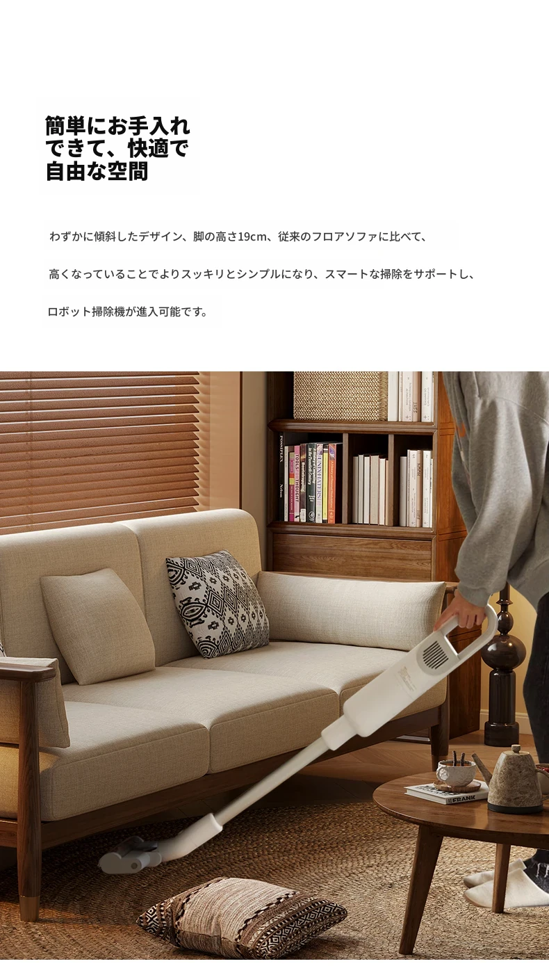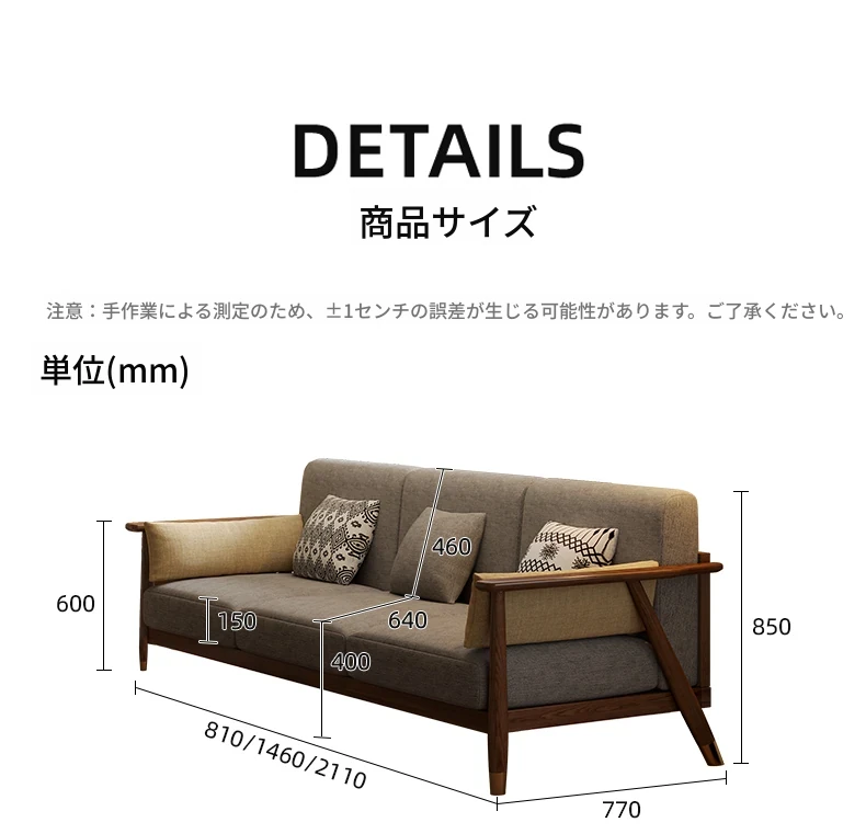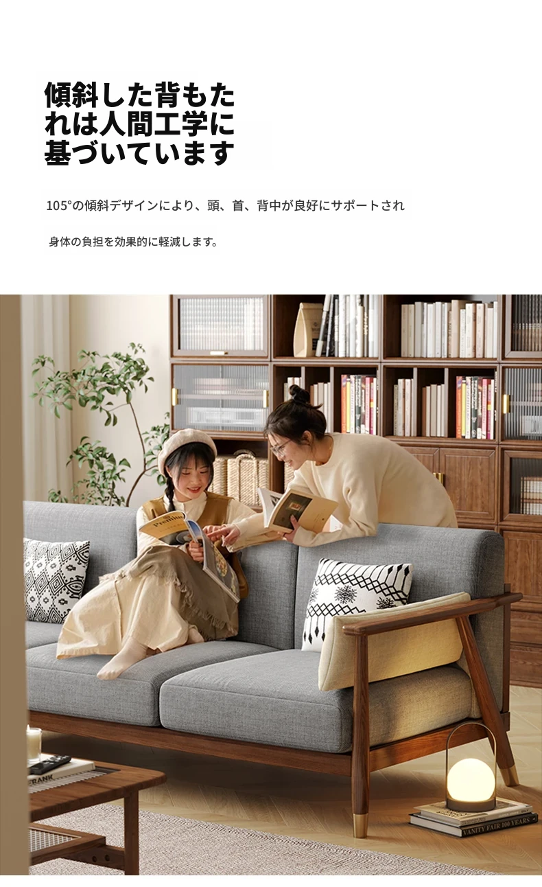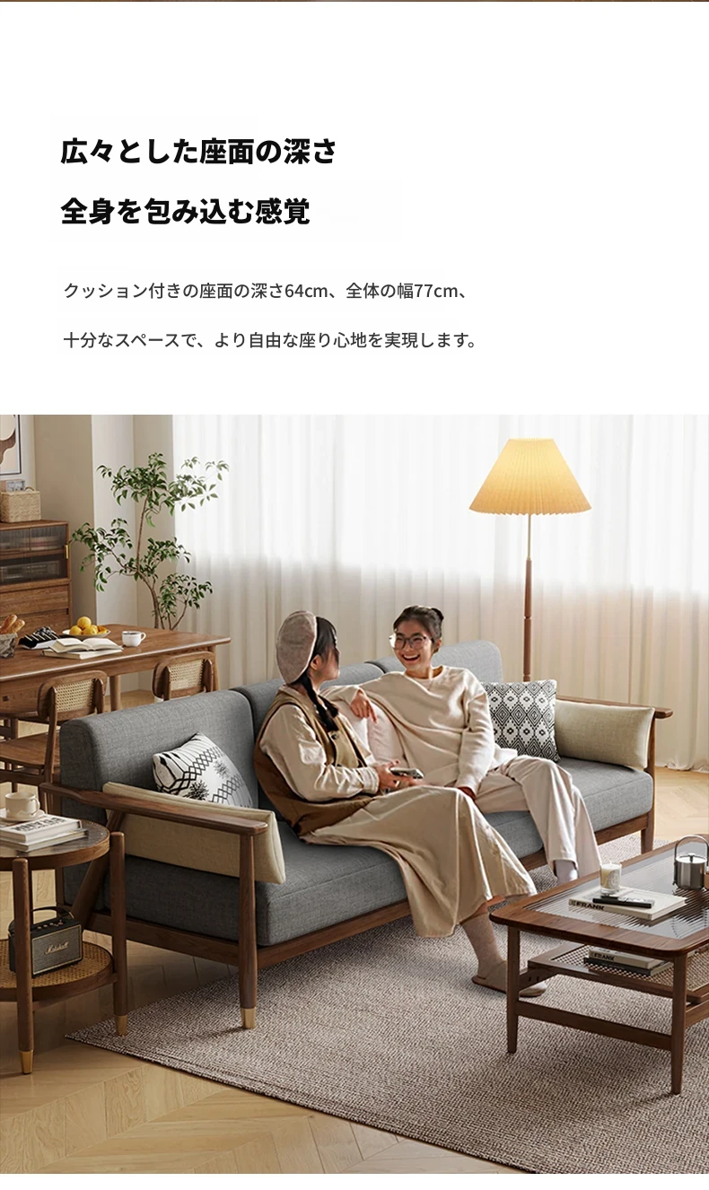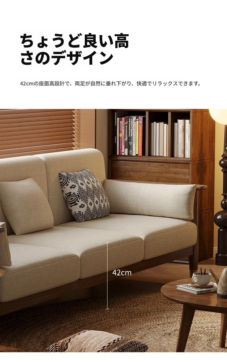 北欧スタイルのコットンリネンファブリックソファ、無垢材使用!黒ウォールナット色とホワイトアッシュのシンプルデザインで、リビングルームに新しい中華風の魅力をプラス。快適さと美しさを兼ね備えた理想的な組み合わせ!