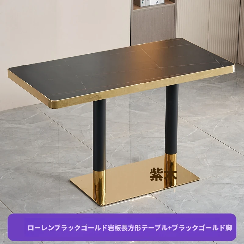 120*60ブラックゴールド模様の岩板+ブラックゴールド無垢鋼板のテーブル脚