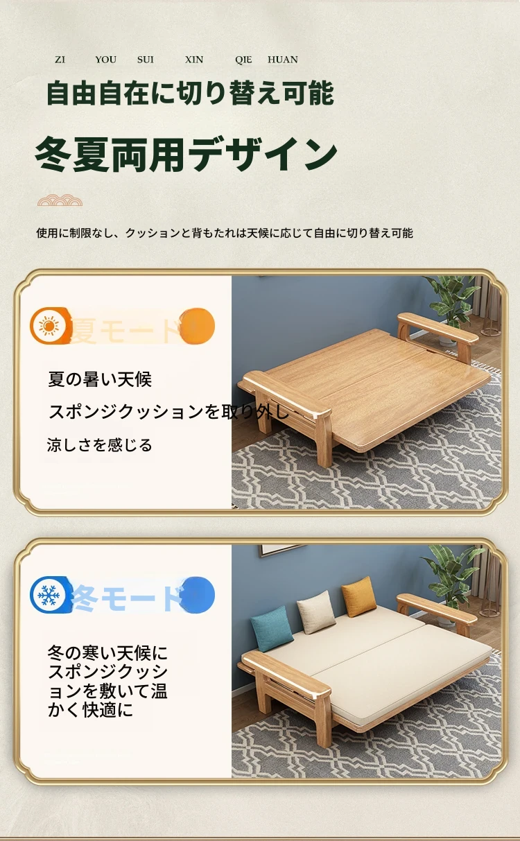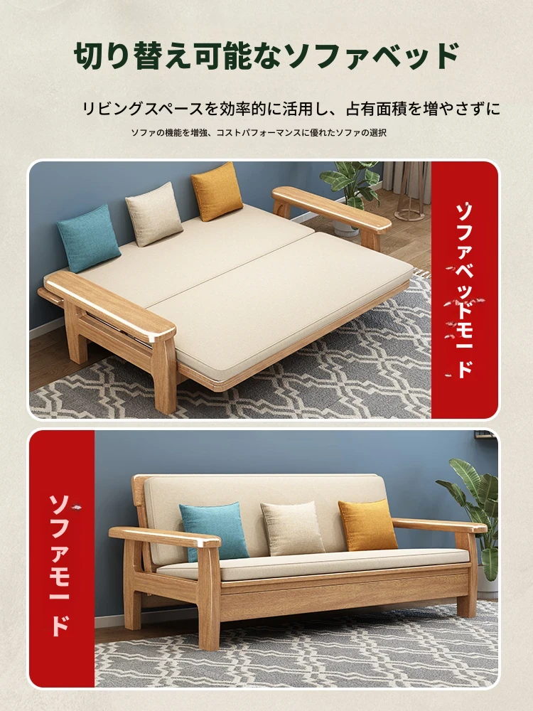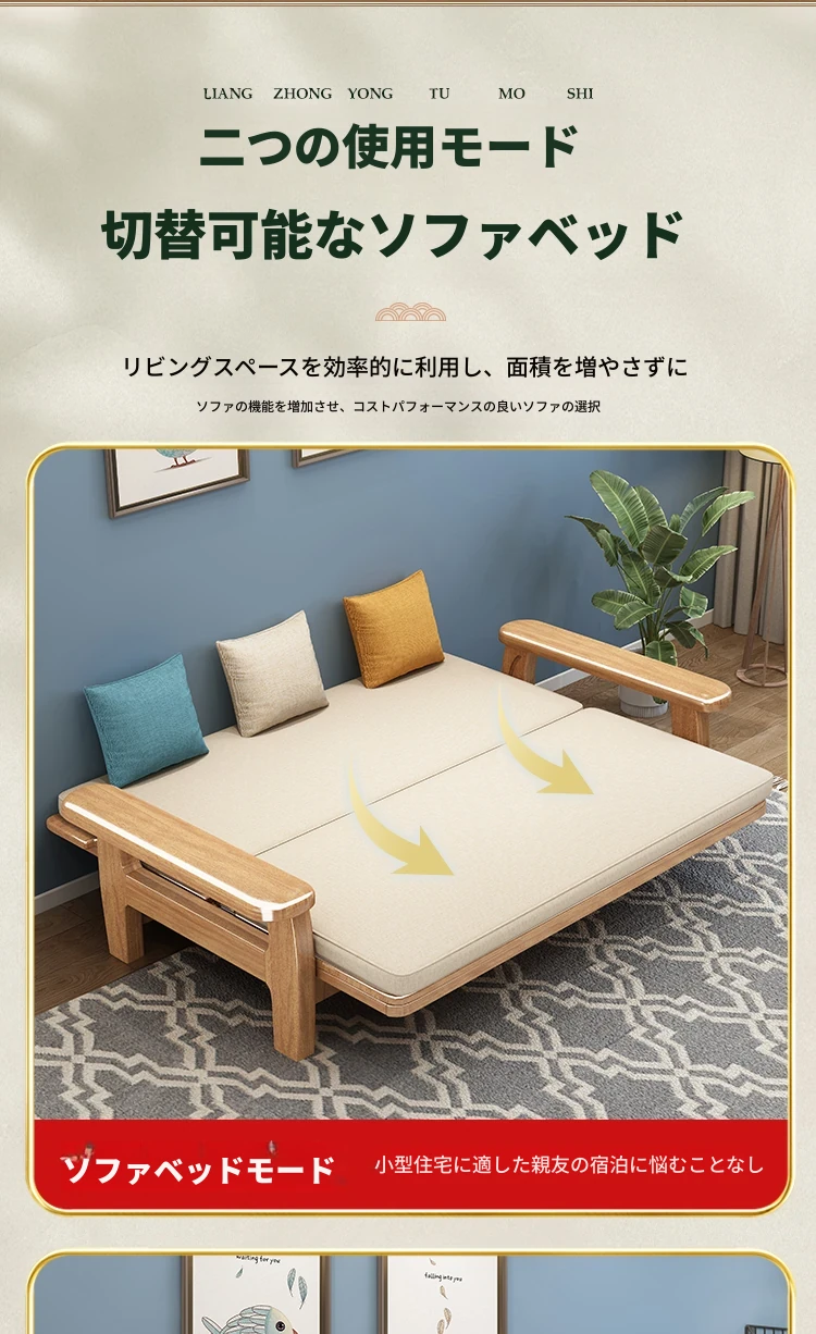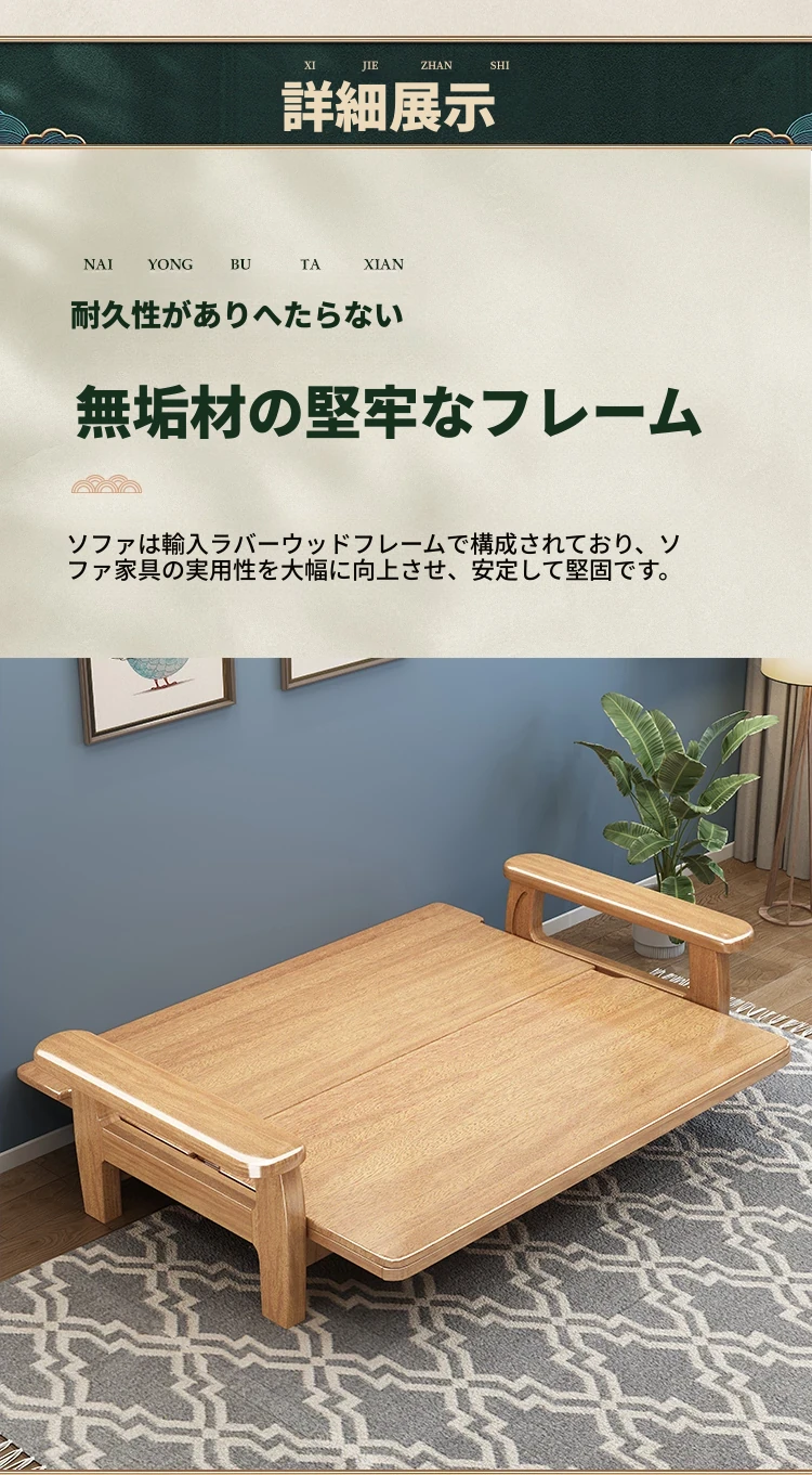 全実木製ソファベッド|伸縮可能な折りたたみ式で、快適な2in1デザイン|天然木使用のソファ一体型で、スペースを有効活用!リラックスと機能性を兼ね備えた一品。