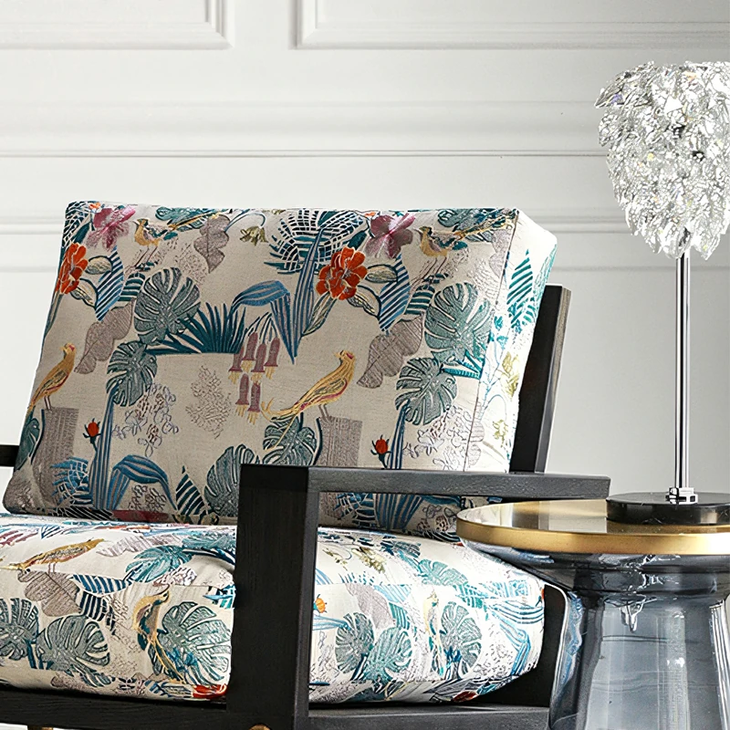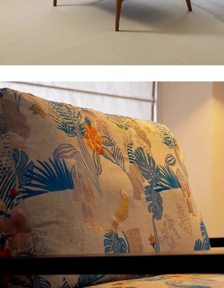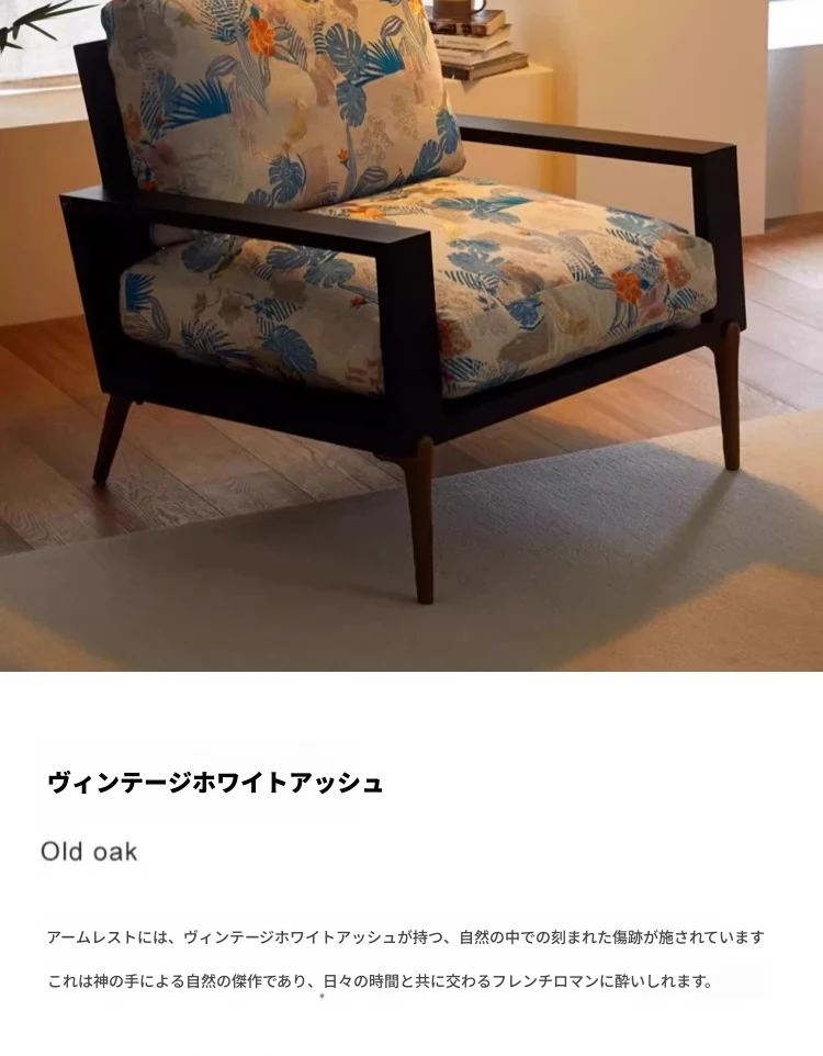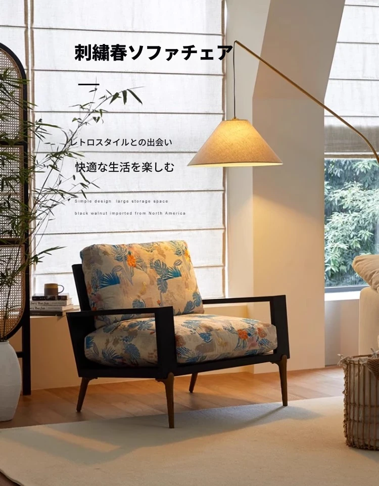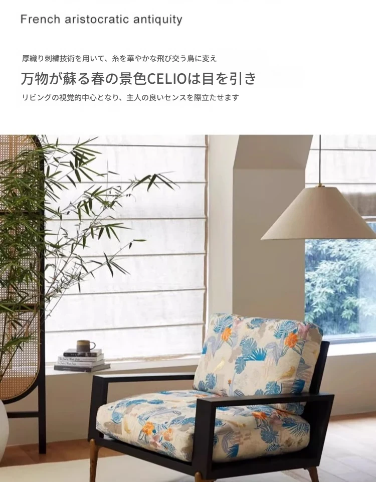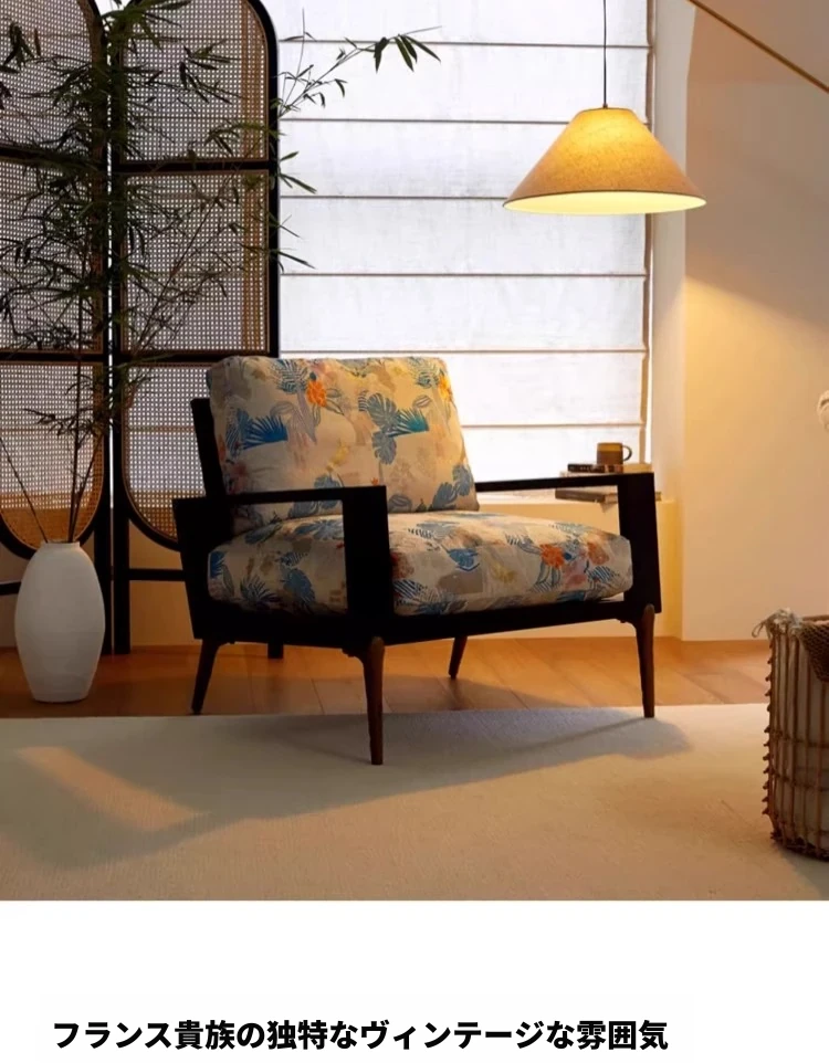 ヴィンテージスタイルの春の椅子|輸入刺繍デザインのデザイナー1人掛けソファ|民宿やリビングにぴったりの無垢材製リラックスチェア