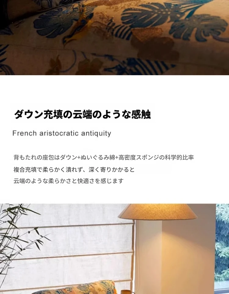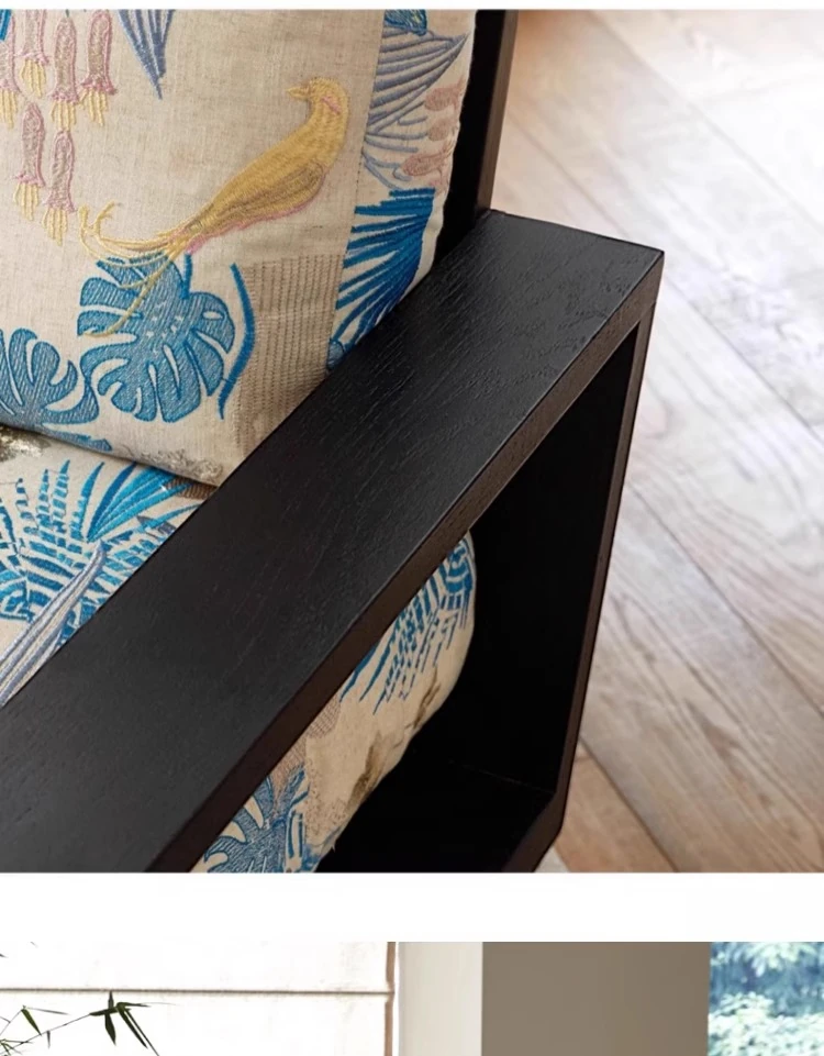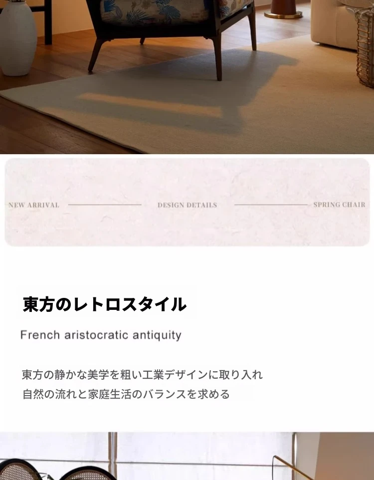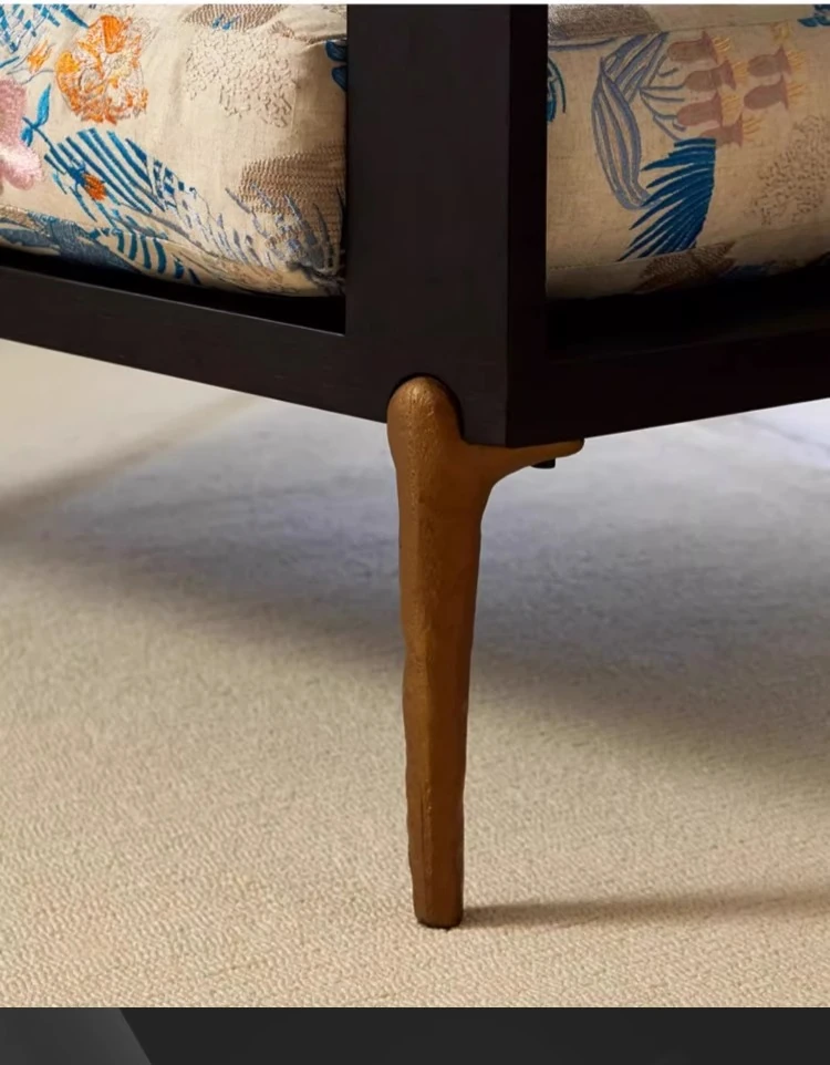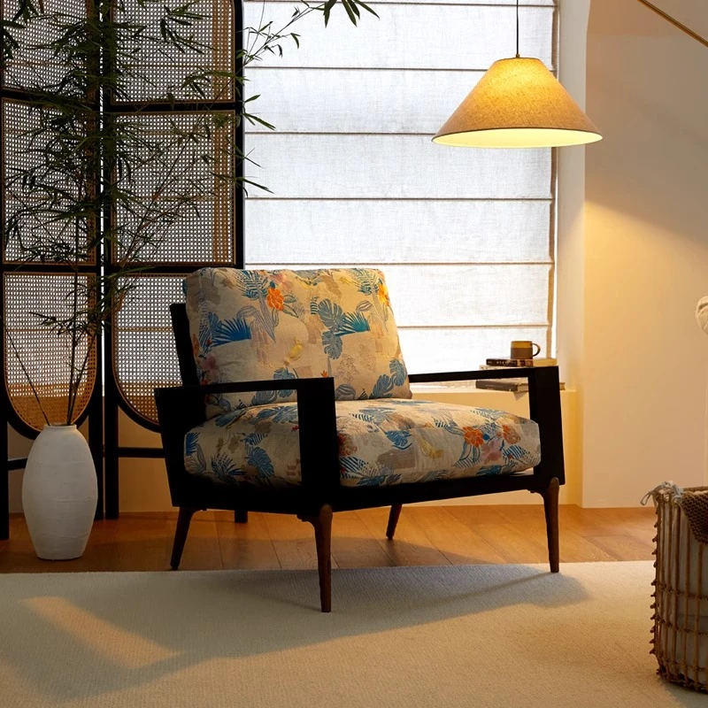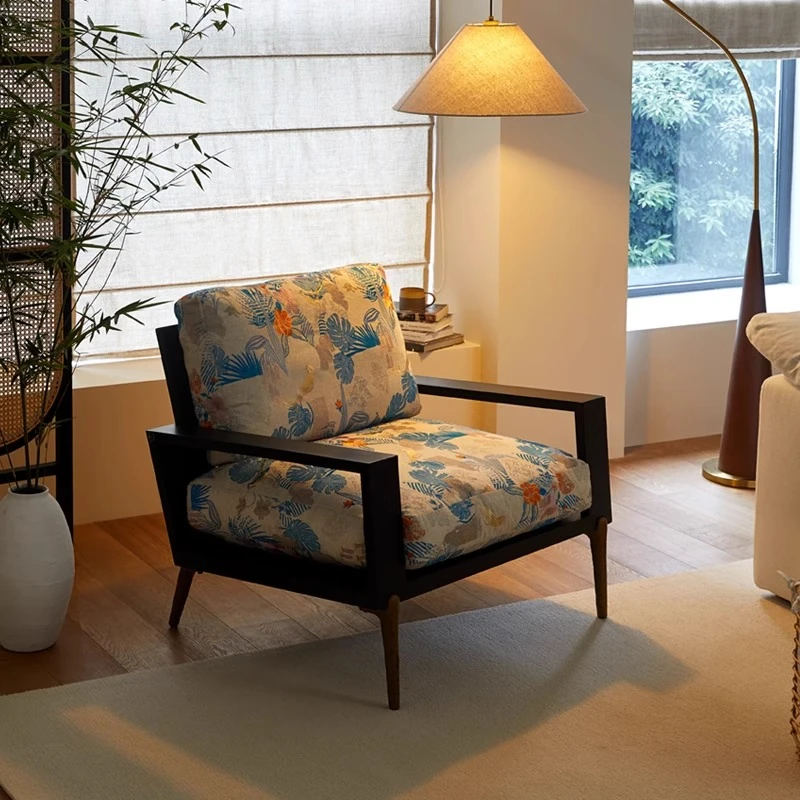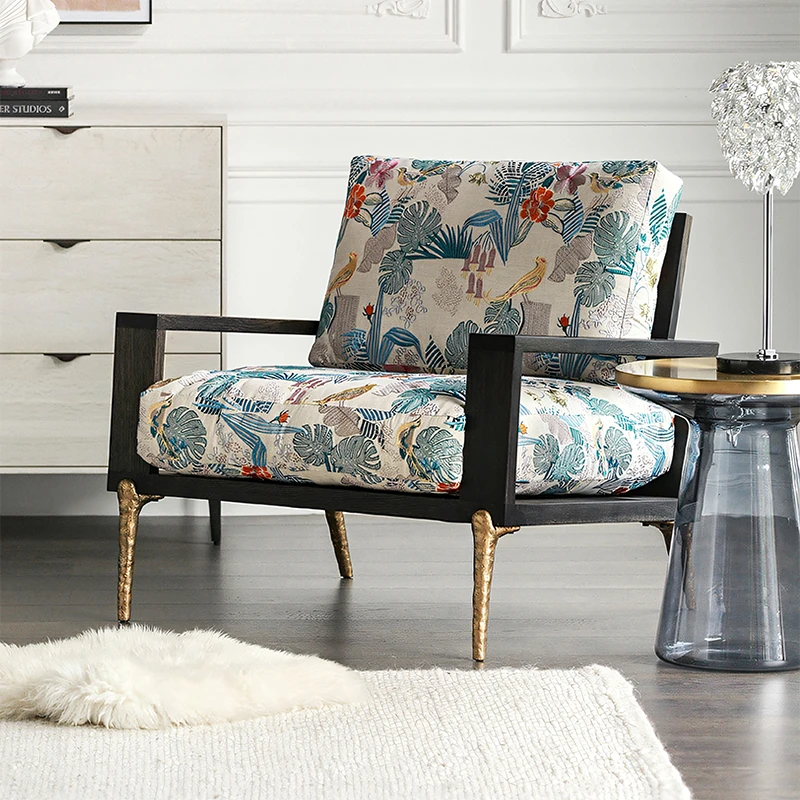 ヴィンテージスタイルの春の椅子|輸入刺繍デザインのデザイナー1人掛けソファ|民宿やリビングにぴったりの無垢材製リラックスチェア
