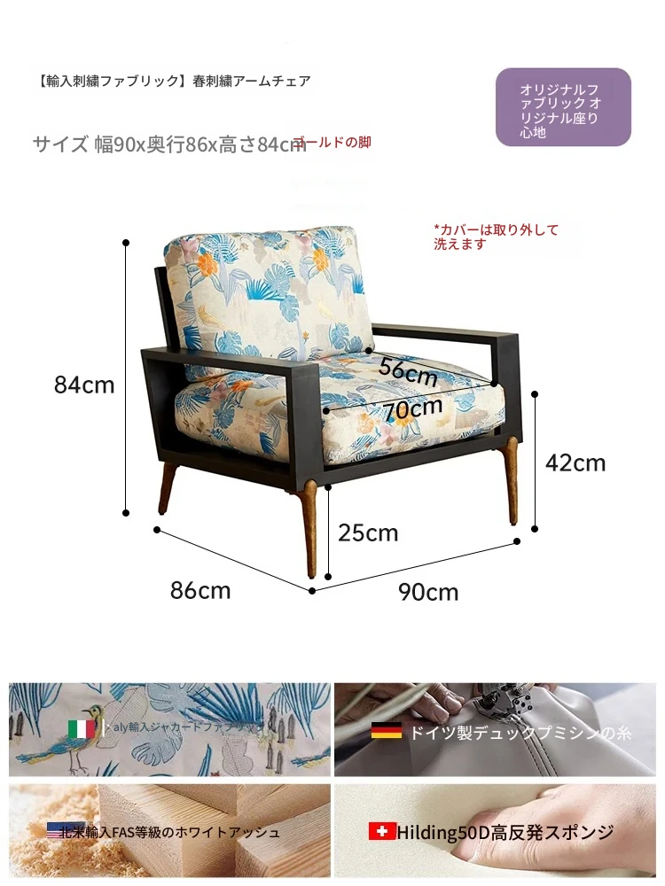 绣春ソファチェア【ホワイトアッシュ+輸入刺繍】ゴールド脚