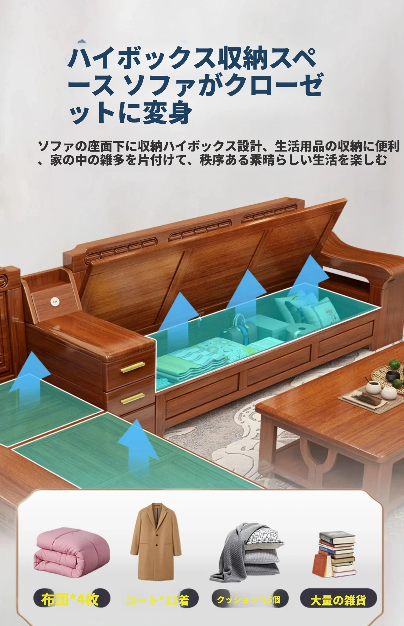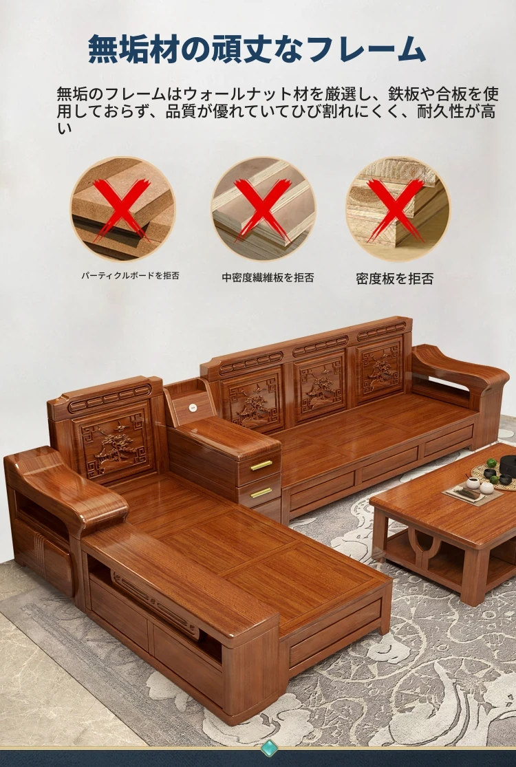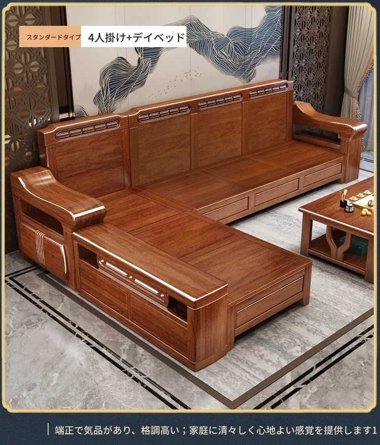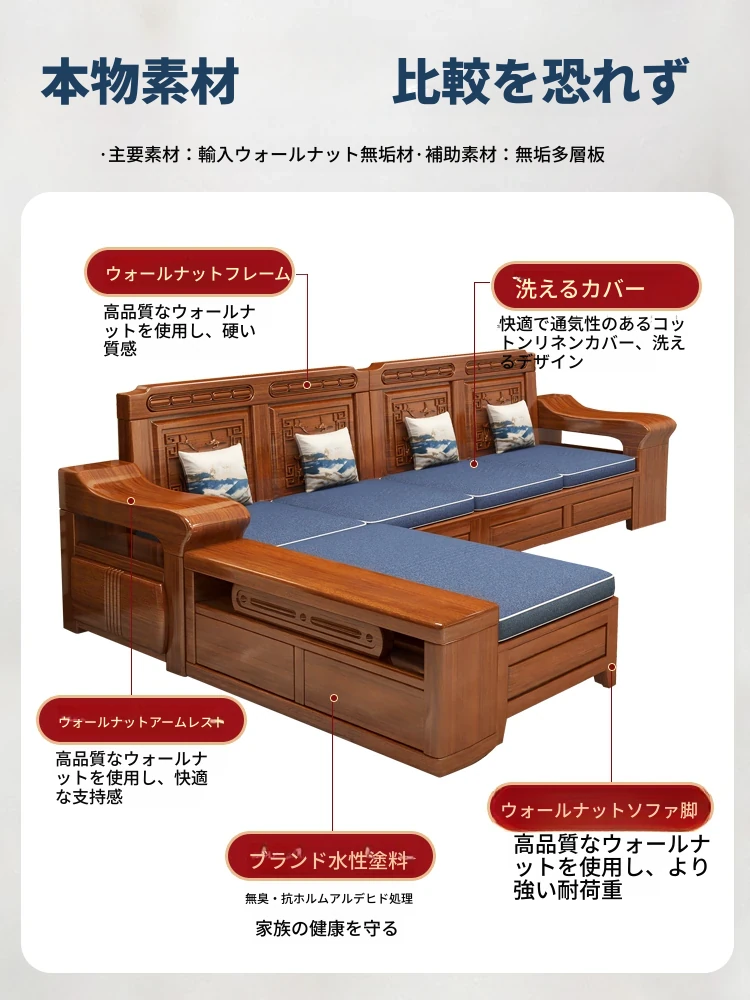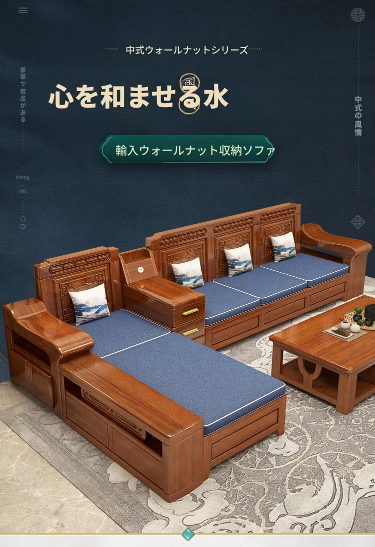 無垢材使用のウォールナットソファ、全木製の収納付きコンビネーション、実用的な木製コーナーソファ。中華風デザインで、リビングルームにぴったりなスタイリッシュな家具です!