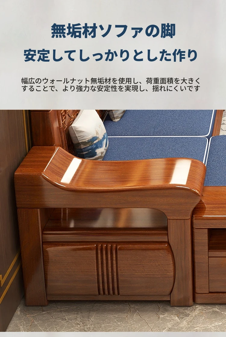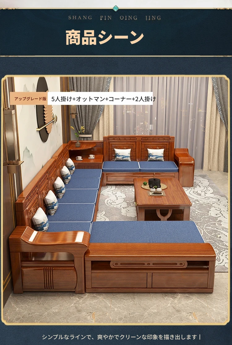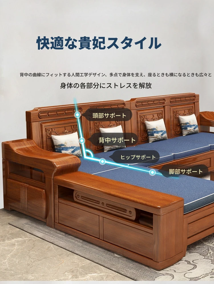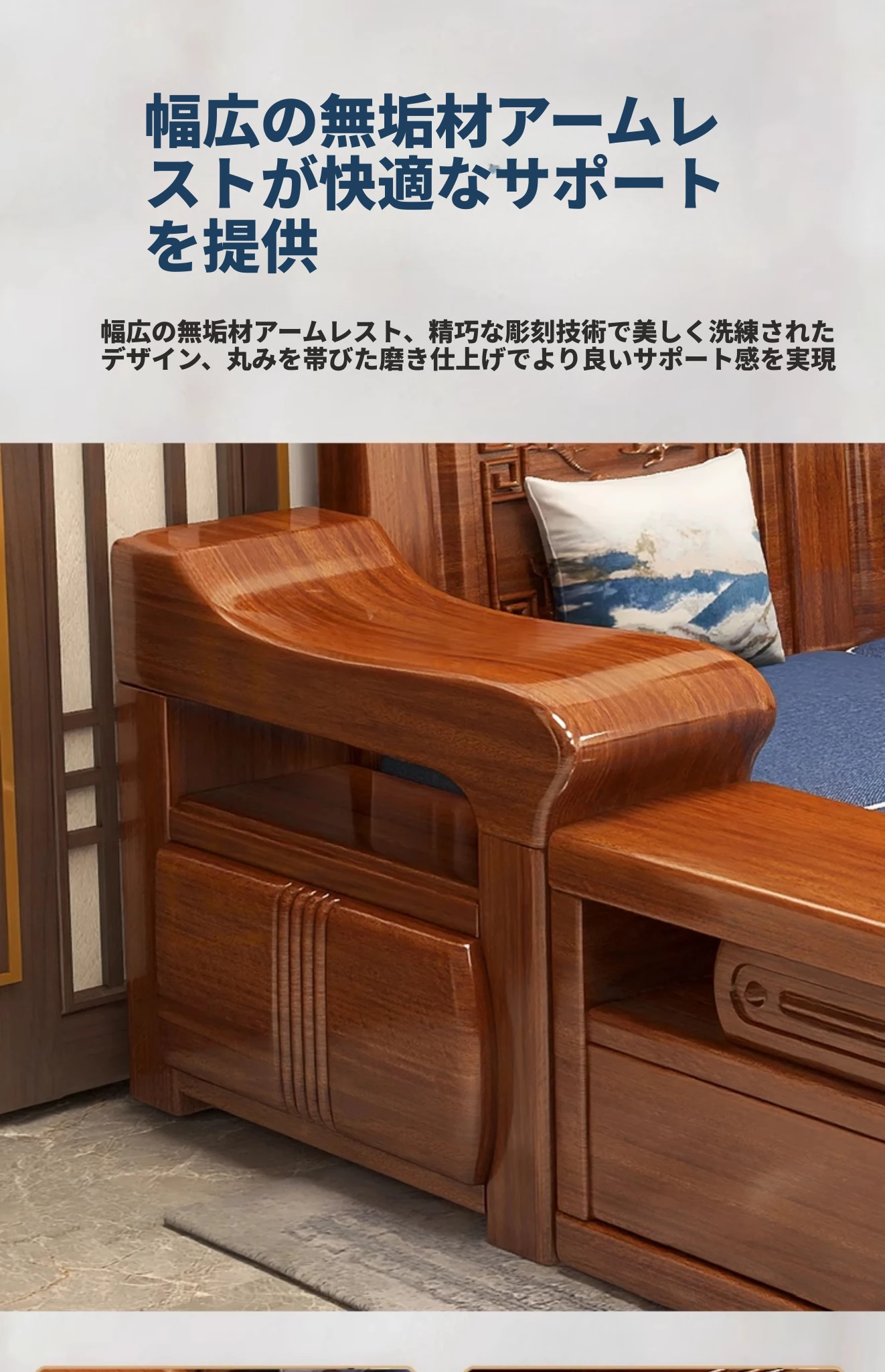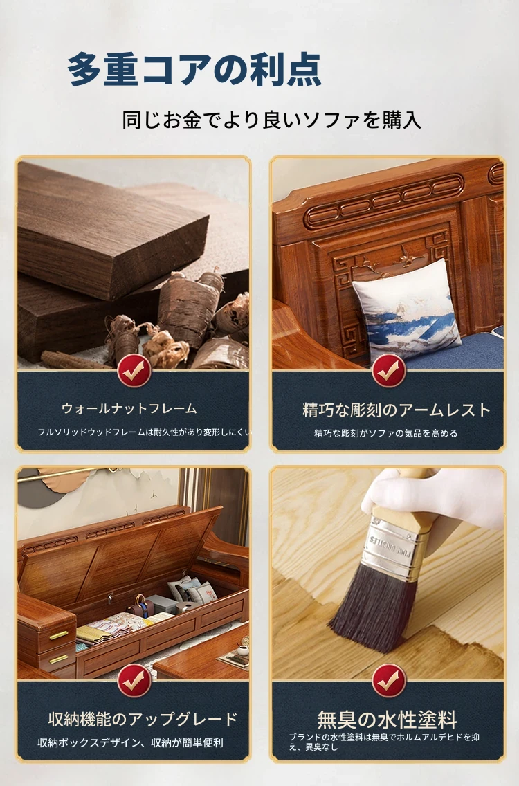 無垢材使用のウォールナットソファ、全木製の収納付きコンビネーション、実用的な木製コーナーソファ。中華風デザインで、リビングルームにぴったりなスタイリッシュな家具です!